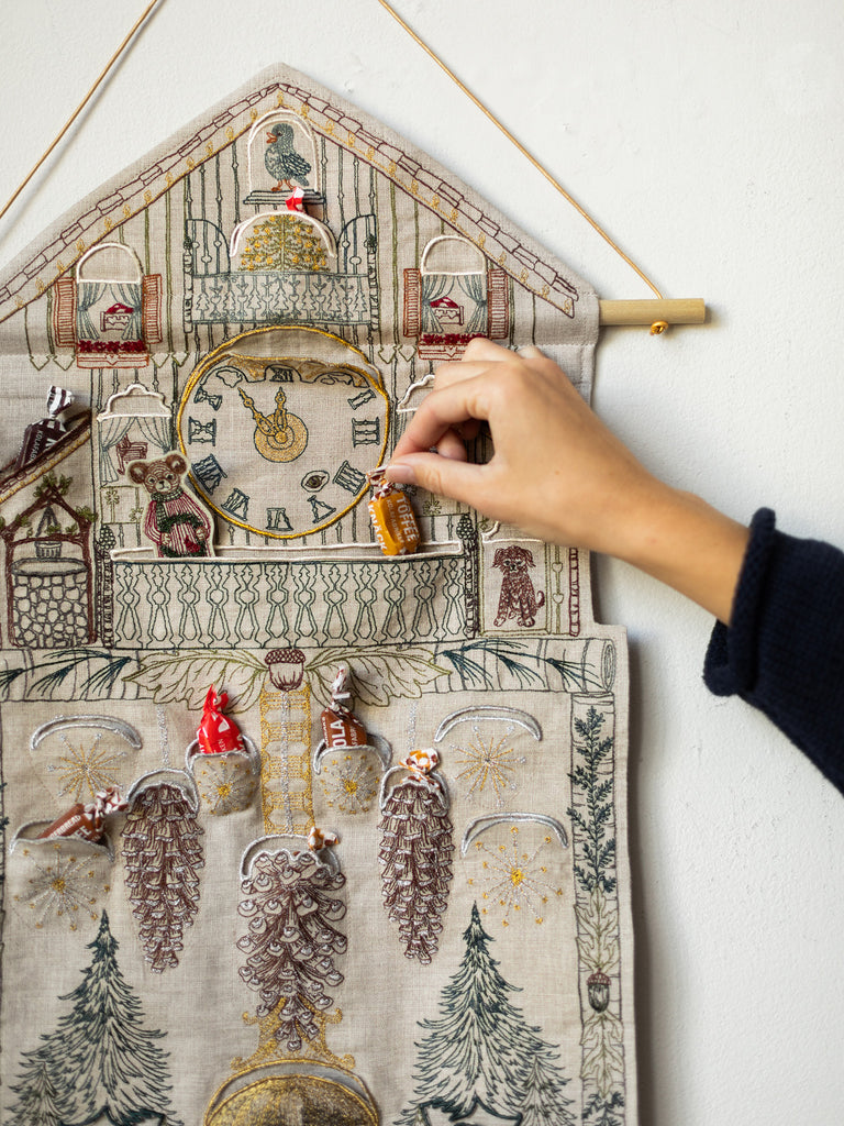 Tick, tock! Count down the days until Christmas with our new Christmas Clock Advent Calendar, inspired by a beloved nursery rhyme. It features an exquisitely detailed cuckoo clock embroidered on 100% natural linen, complete with a gold metallic full moon pendulum and stunning pinecone-shaped weights. This calendar has 25 hidden pockets for storing gifts and surprises for each day leading up to Christmas. It also includes a felt mouse holding a wreath that can be used as a counter, ready to run up the clock when midnight strikes! A wood dowel is included for display.