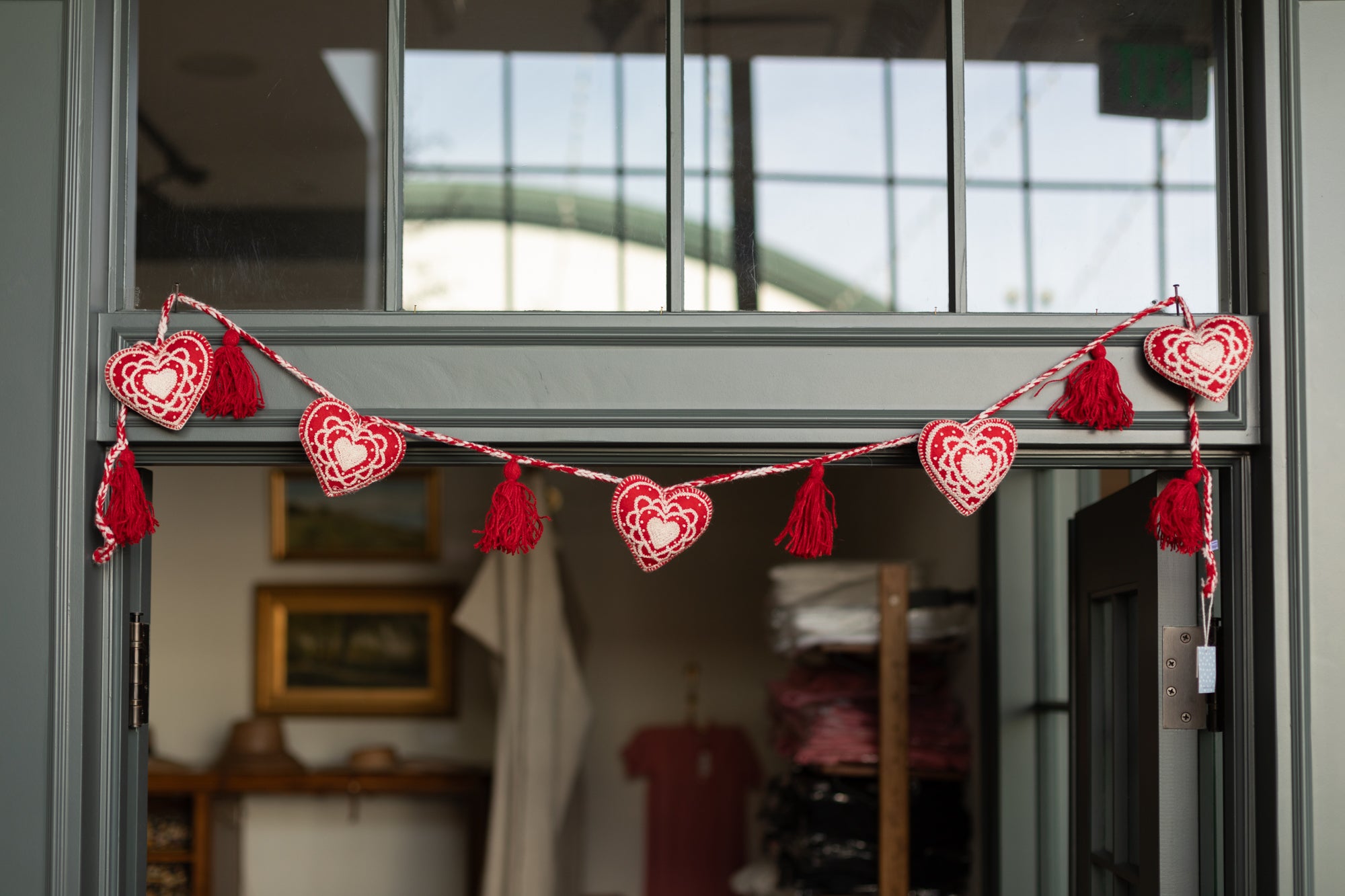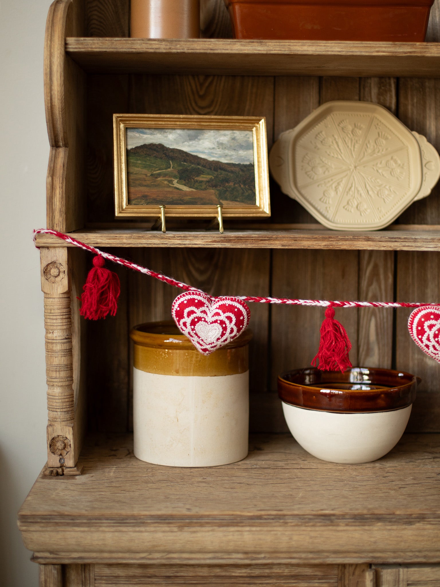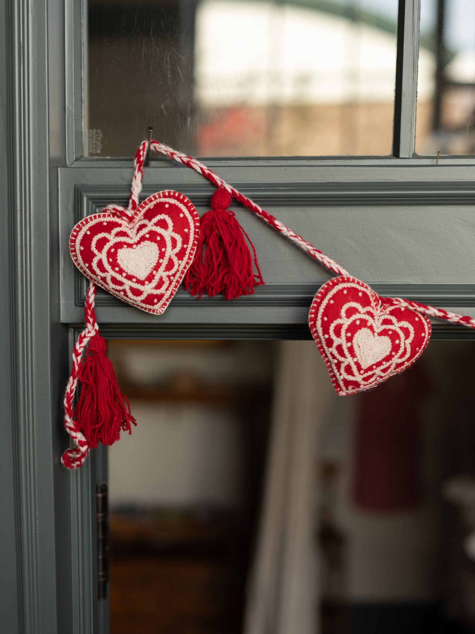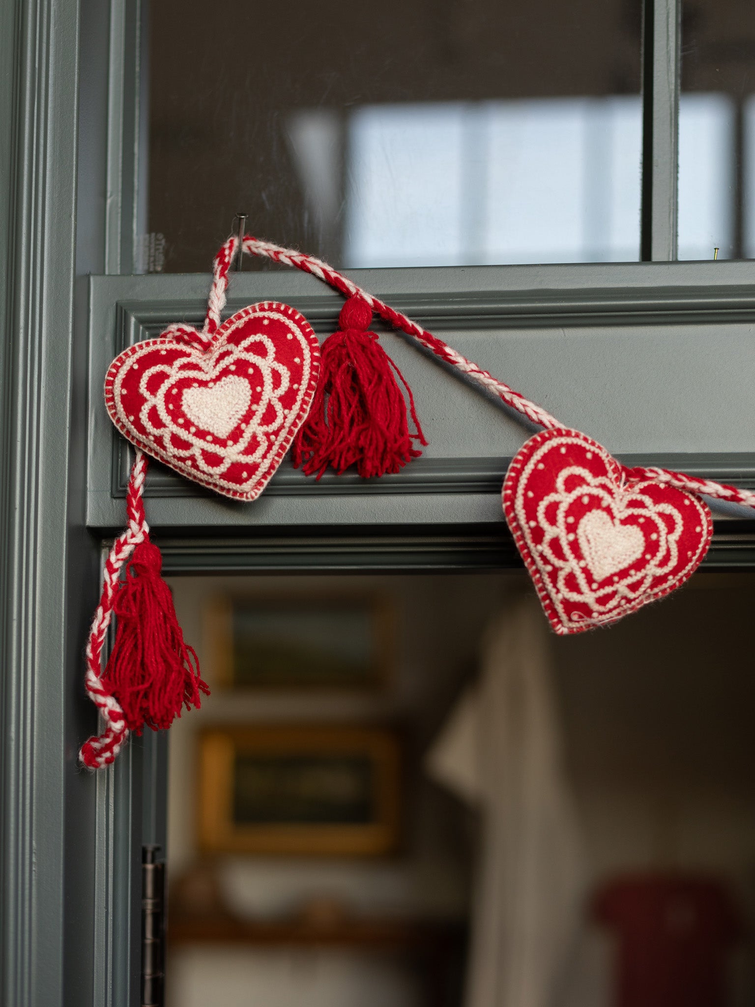 Create a sweet atmosphere this holiday with the Red Valentine Garland. It features charming detailed embroidery that will bring a special touch to your Valentine's Day decor. The ornaments are 4" tall and the garland is 80" long. It is made of wool with acrylic filling and wool tassels on a cord.