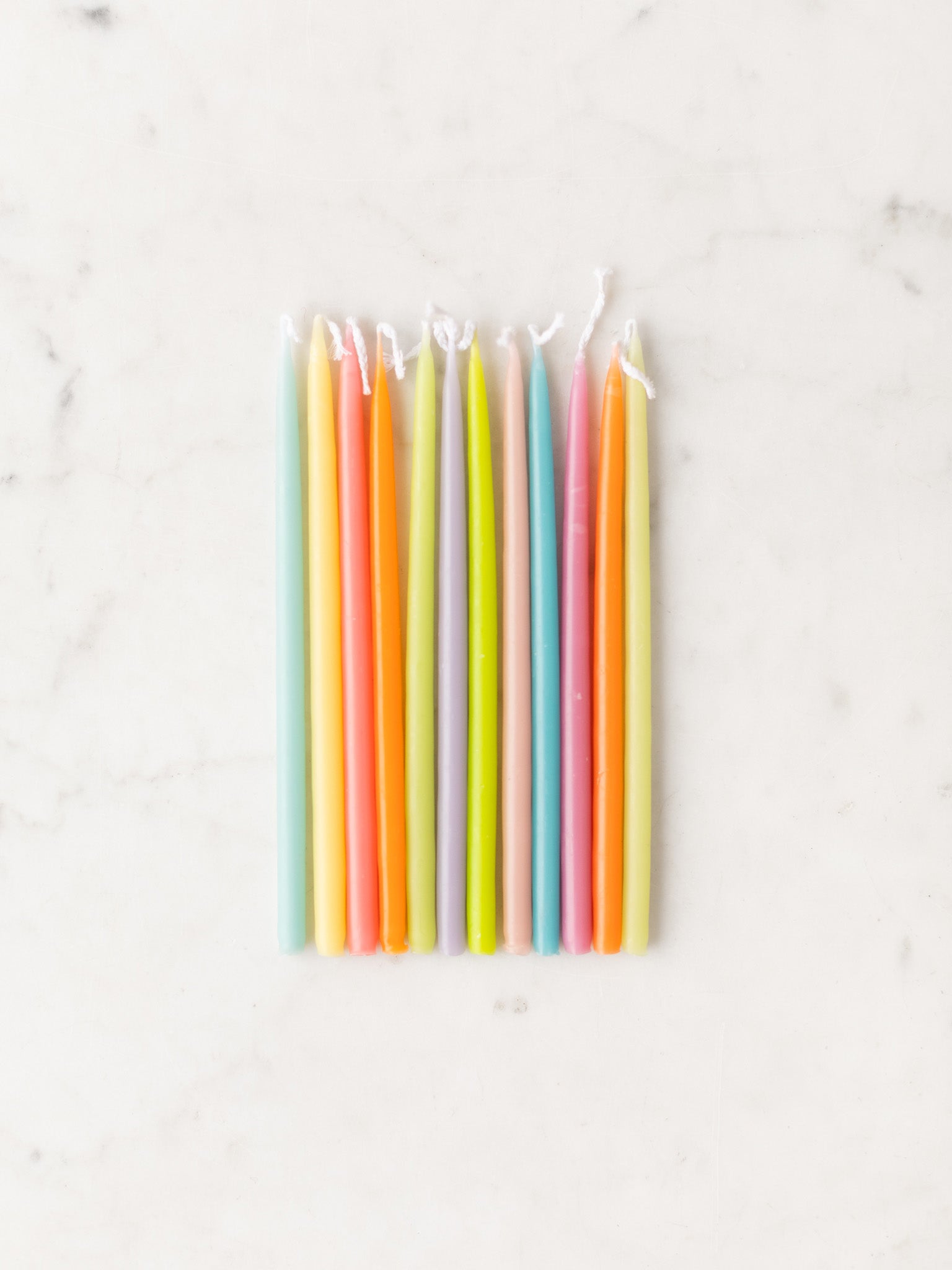 These pastel rainbow candles are designed for birthday cakes and celebratory moments. Each candle features a soft ombré of pastel colors in a slim tapered shape. Arrange them in a gradient or mix the colors for a playful look on the cake. Light them, make a wish, blow out the candles, and enjoy the moment before the cake is cut.