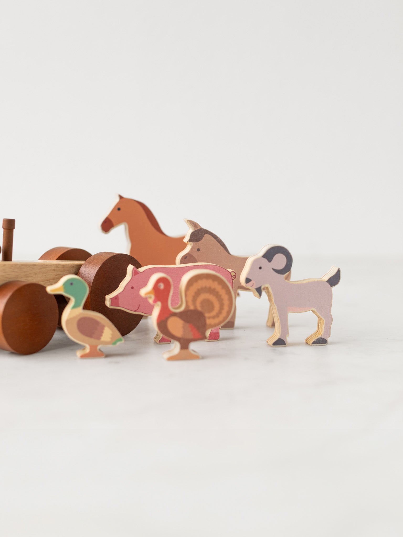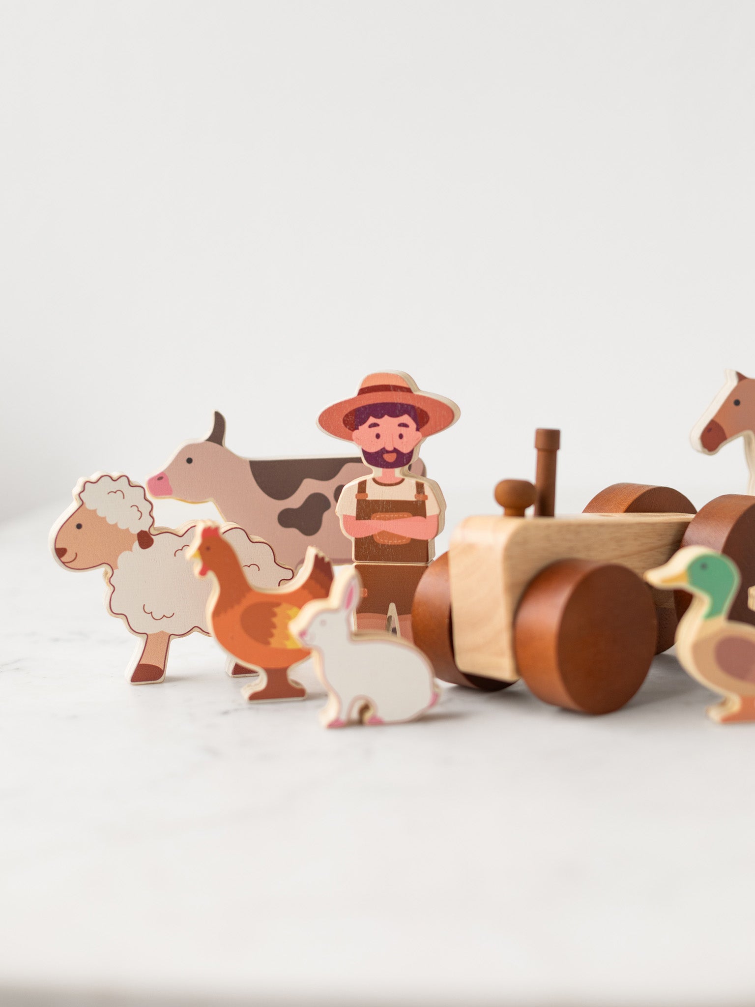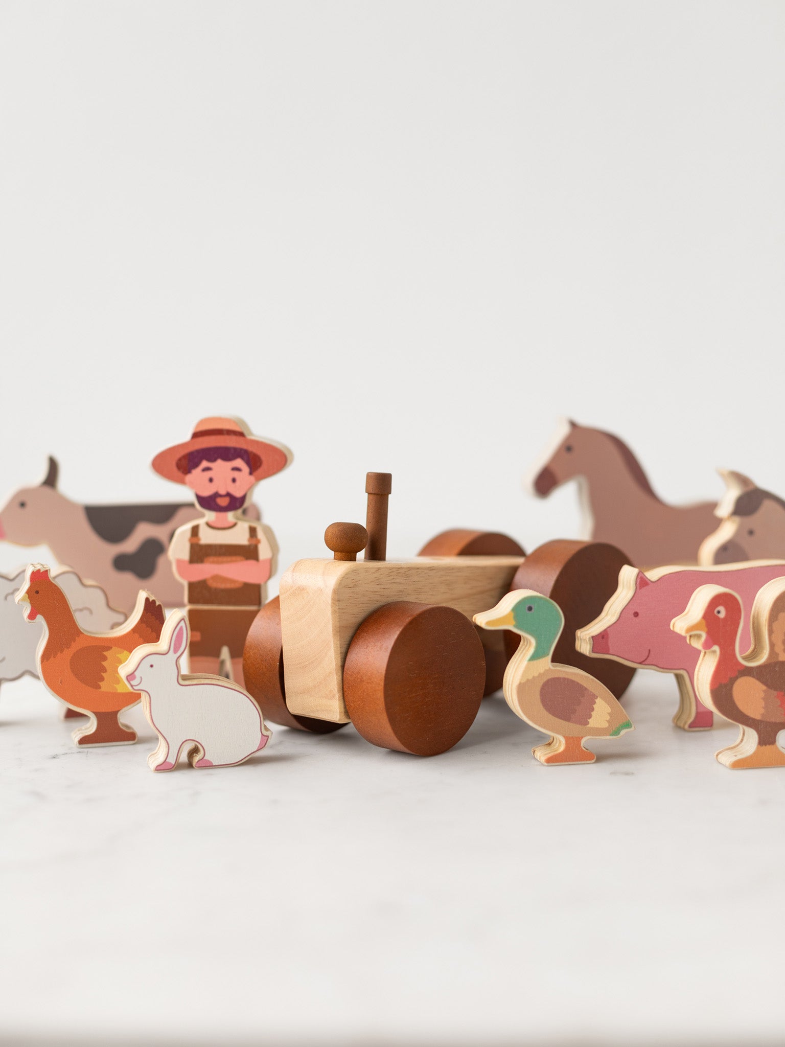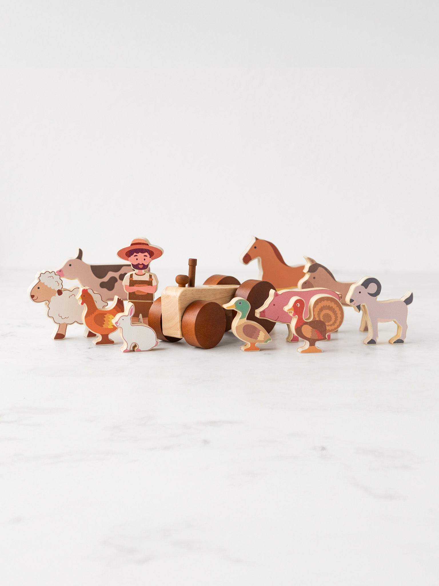 This wooden Farm Animals & Tractor Set brings a little piece of the countryside into playtime. Inside are familiar barnyard friends: a cow, sheep, horse, donkey, pig, goat, rabbit, chicken, turkey, and duck, along with a sturdy wooden tractor. With their imagination, children can line them up in the pasture, drive the tractor through the fields, or make up stories as they go.