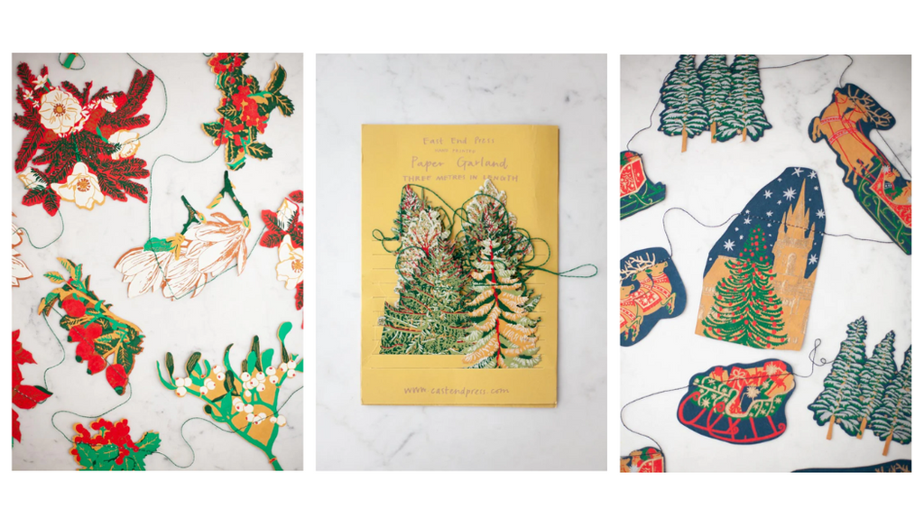 Hand-printed three-meter long paper garland, featuring ten screen printed paper shapes of different festive items. The garland is printed on both sides on thick, handmade cotton paper. The shapes are sewn in a random order along a strong cotton thread, with hanging loops on either end, meaning you can hang your garland straight away!