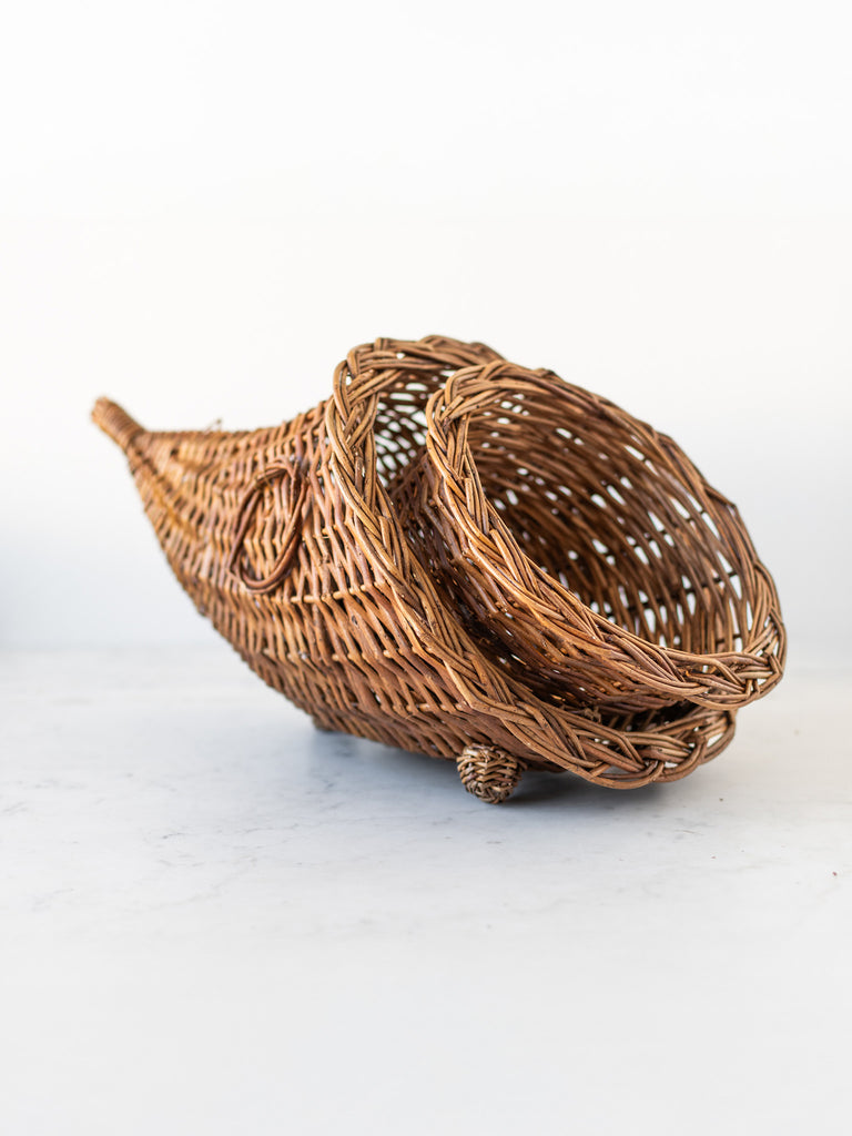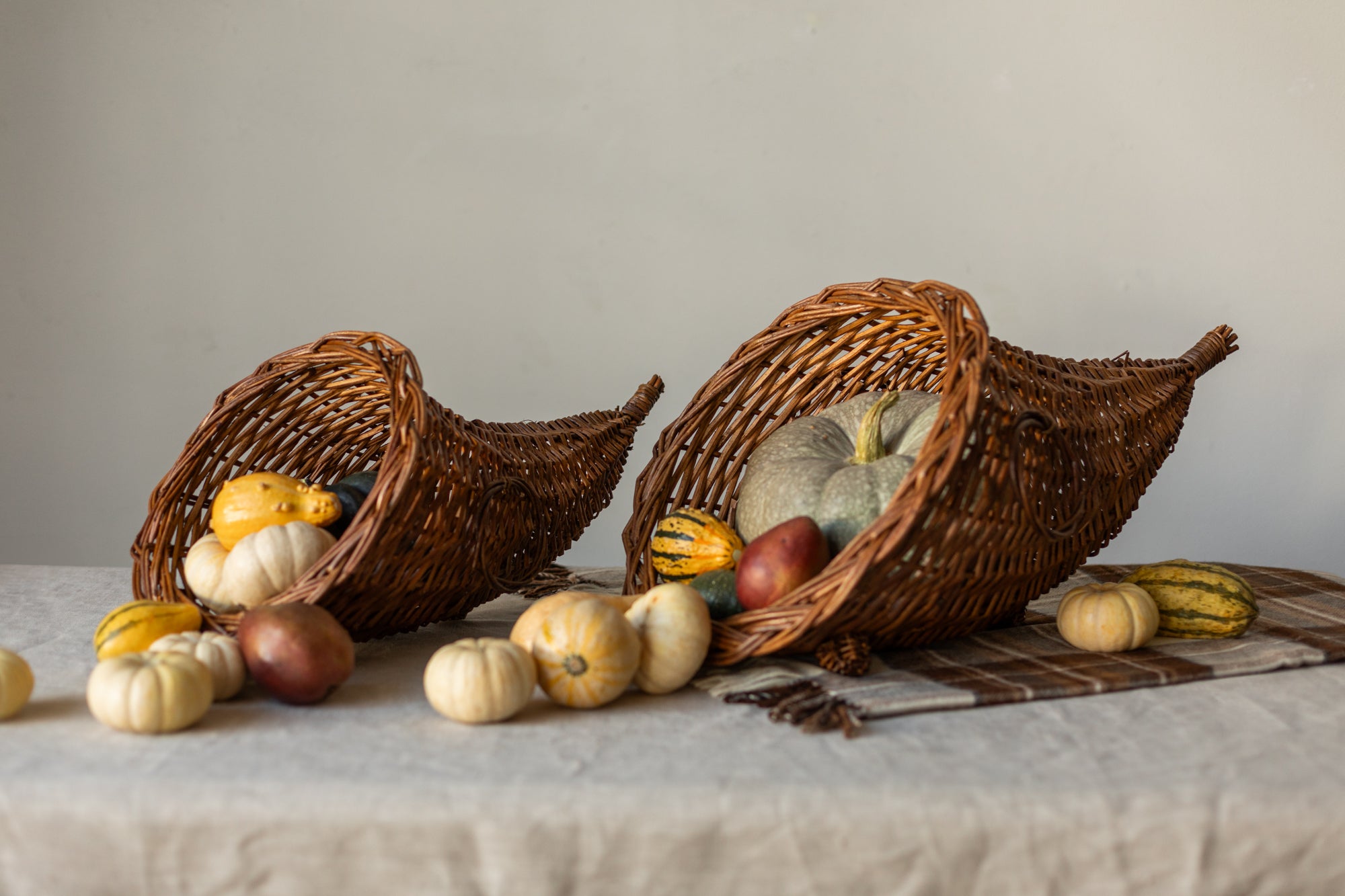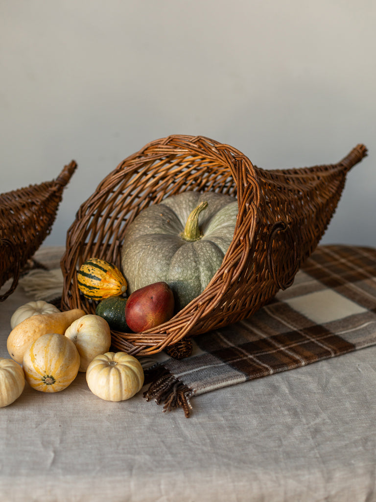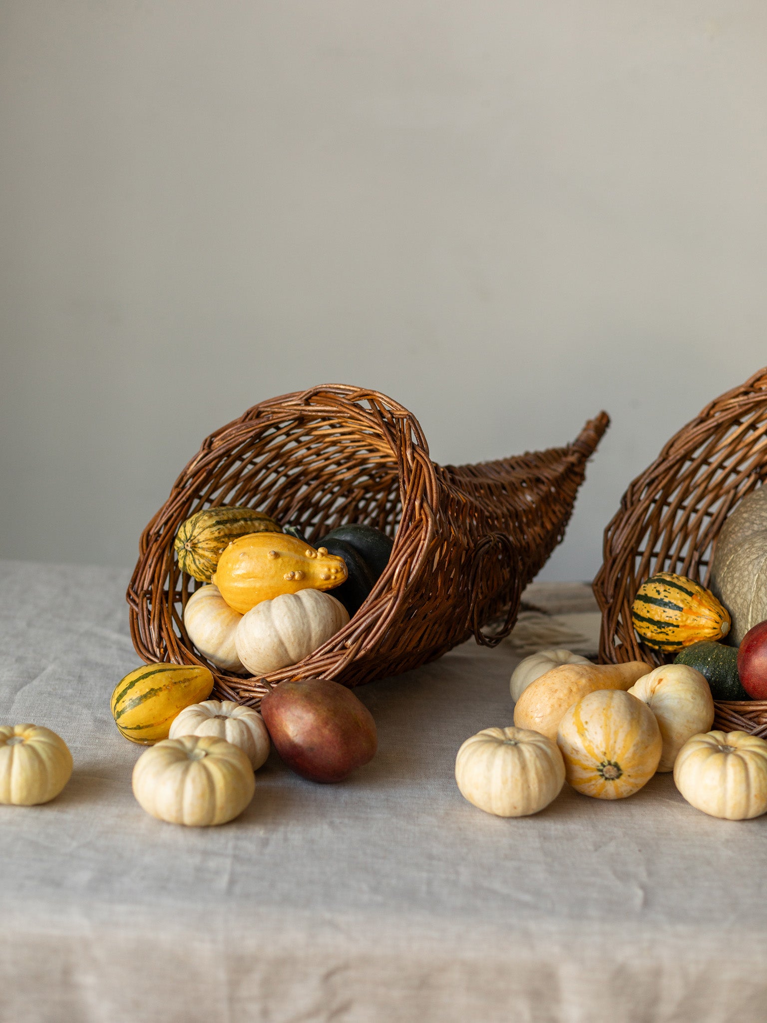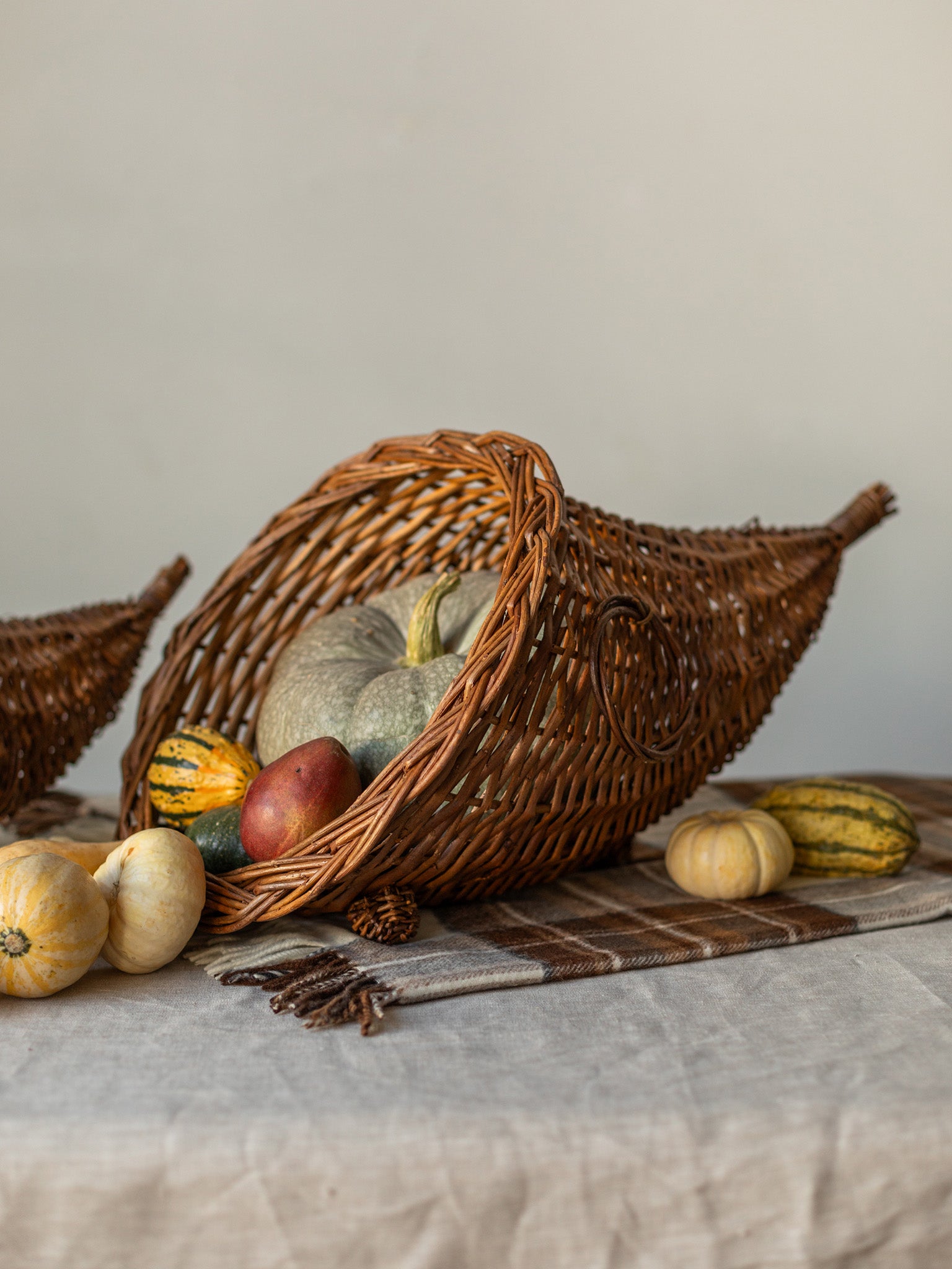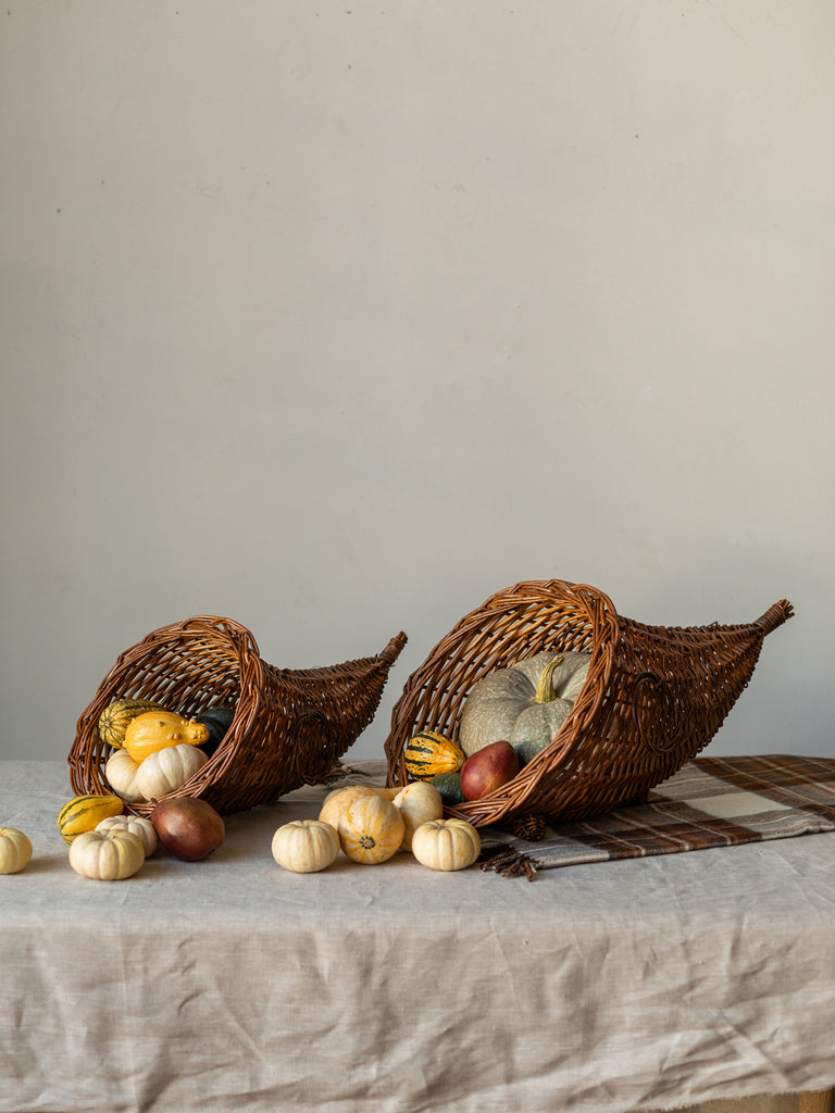 The cornucopia has long been a symbol of abundance and gratitude, dating back to ancient harvest festivals. Traditionally filled with fruits and grains, it celebrates the season’s gifts and the joy of gathering. These woven cornucopias, available in two sizes, bring that same spirit into your home. Fill them with pumpkins, apples, pears, or bits of nature like pinecones and autumn leaves for a display that reminds us how much there is to be thankful for.