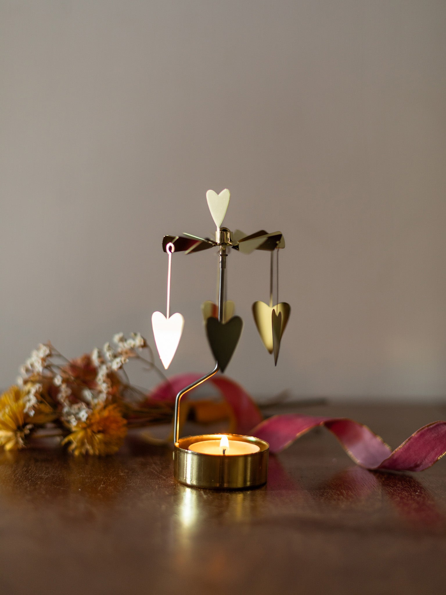 When you light the small candle, the rising heat spins the delicate brass rotary, making the shapes of dala horses, dandelions, and snowflakes dance across the walls.