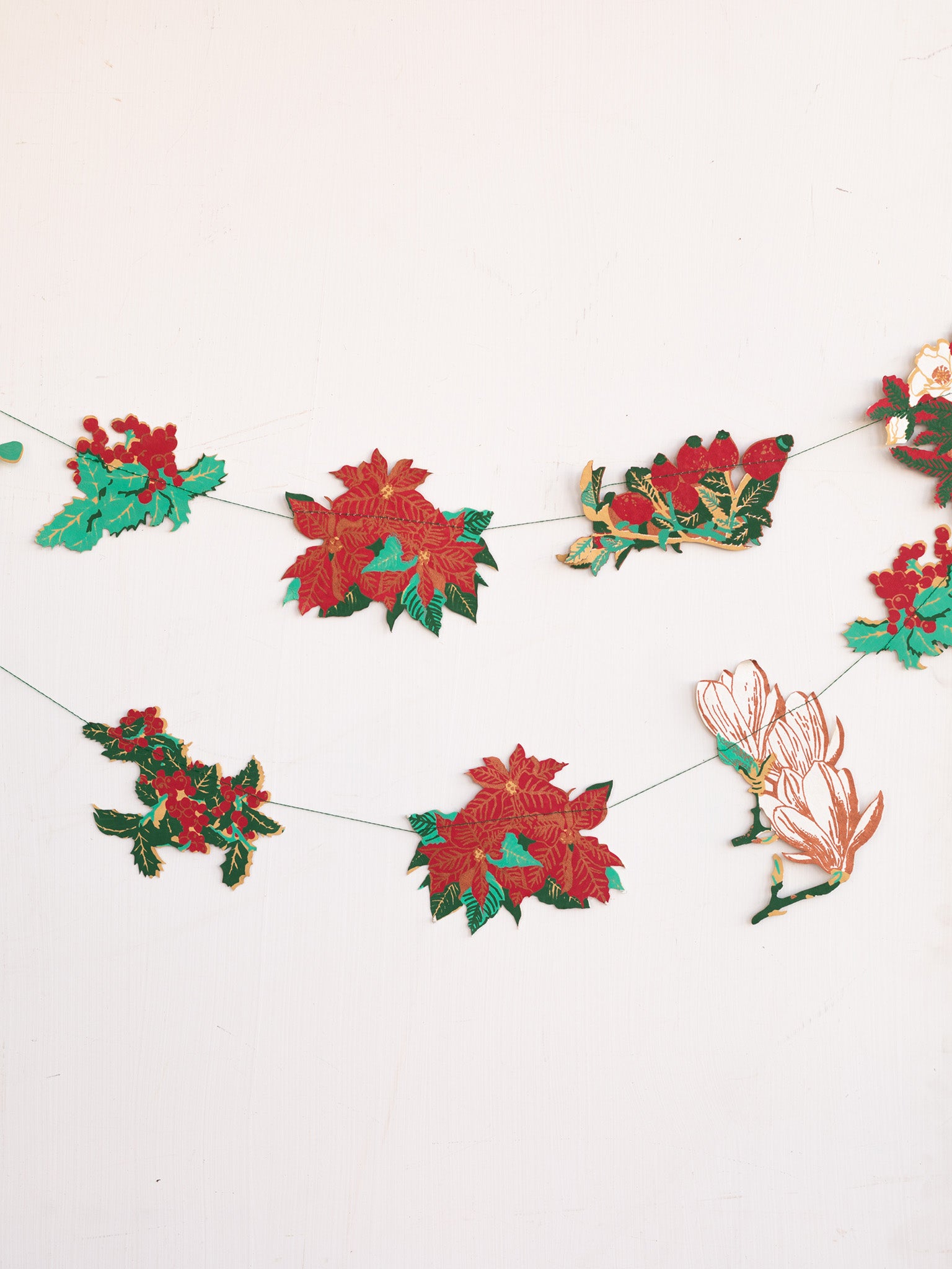Hand-printed three-meter long paper garland, featuring ten screen printed paper shapes of different festive items. The garland is printed on both sides on thick, handmade cotton paper. The shapes are sewn in a random order along a strong cotton thread, with hanging loops on either end, meaning you can hang your garland straight away!