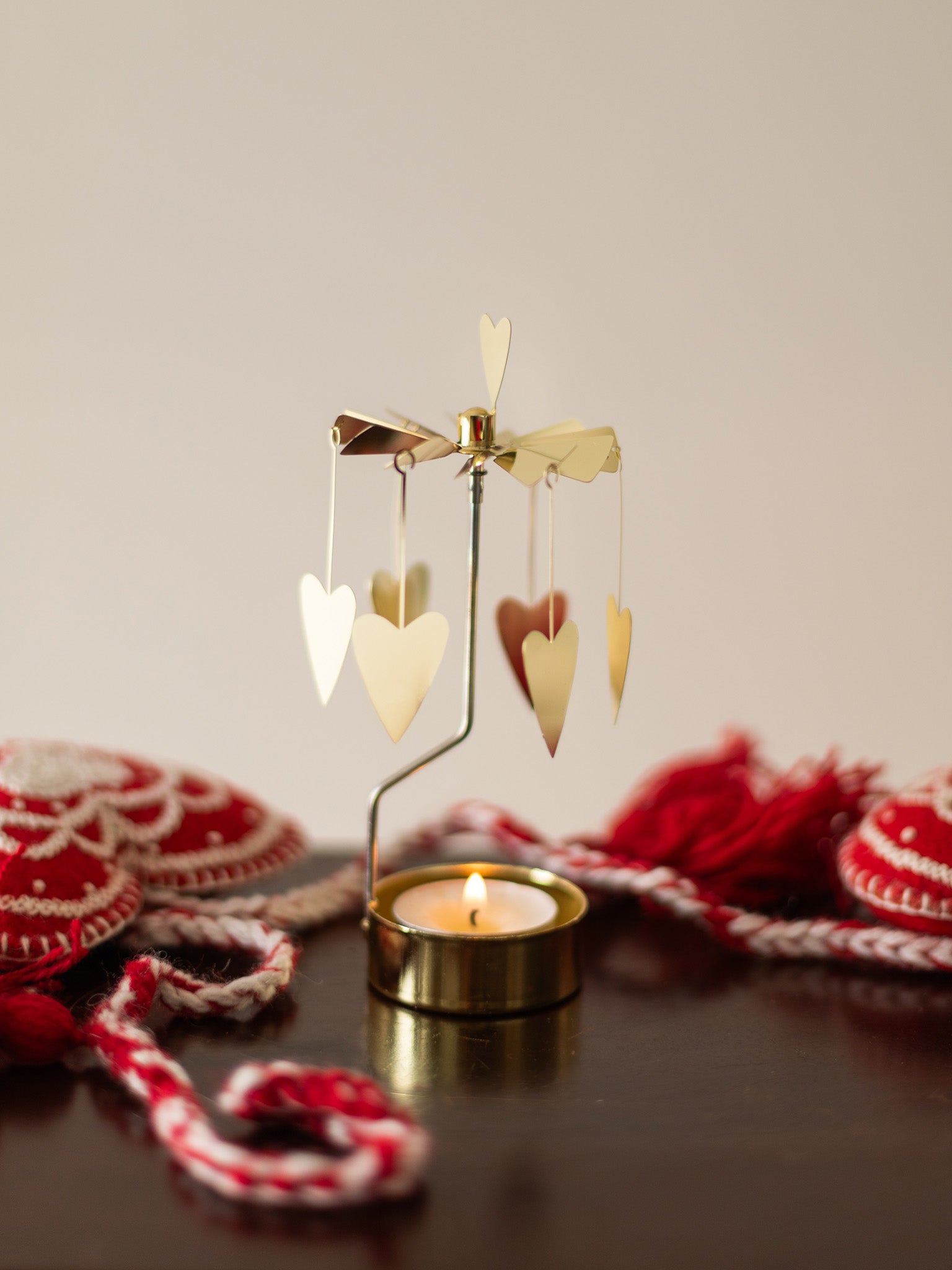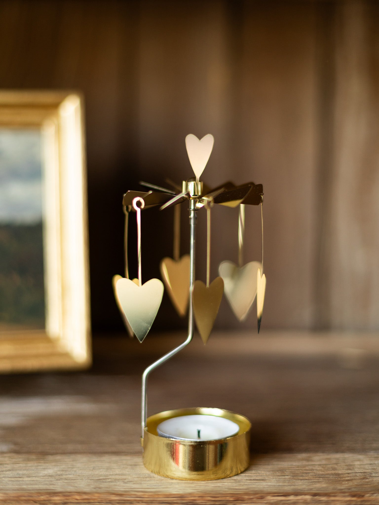When you light the small candle, the rising heat spins the delicate brass rotary, making the shapes of dala horses, dandelions, and snowflakes dance across the walls.