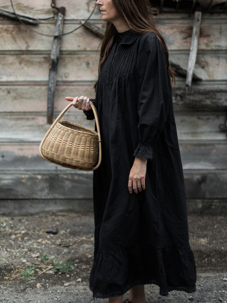 Crafted from premium cotton poplin, its gentle drape and jet-black hue hide anything you don't want seen. These gowns are perfect for the chilly evenings ahead, as the poplin is a bit thicker than our white cotton nightgowns. Whether you're reading spooky stories by the fireside or conquering tasks around your homestead, its flow keeps you at ease. Don't be shocked if you see me wearing it around town with my trench coat thrown over the top. It looks fab then too.