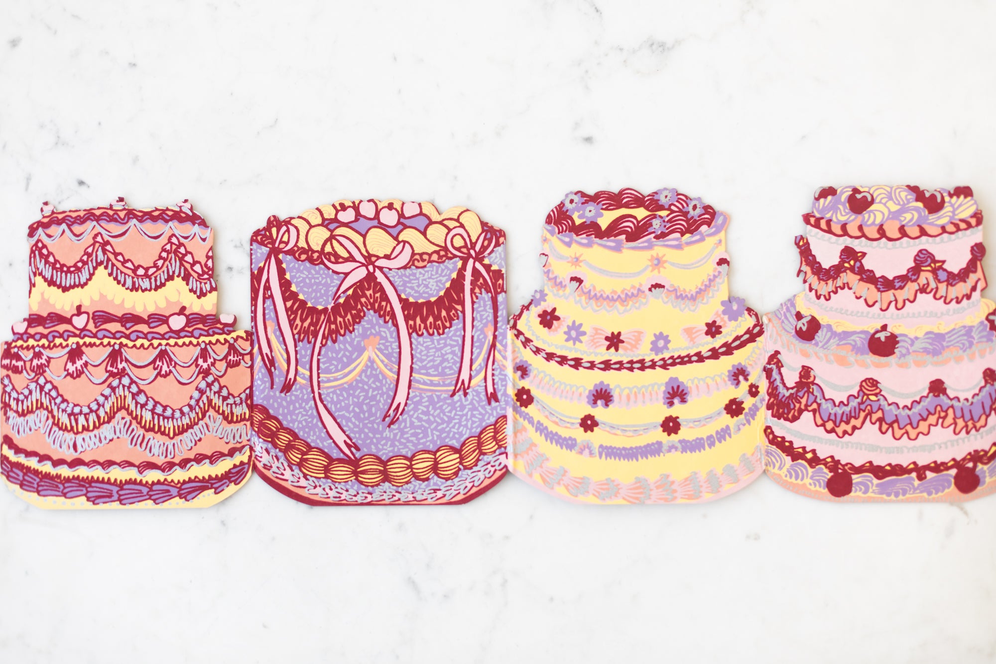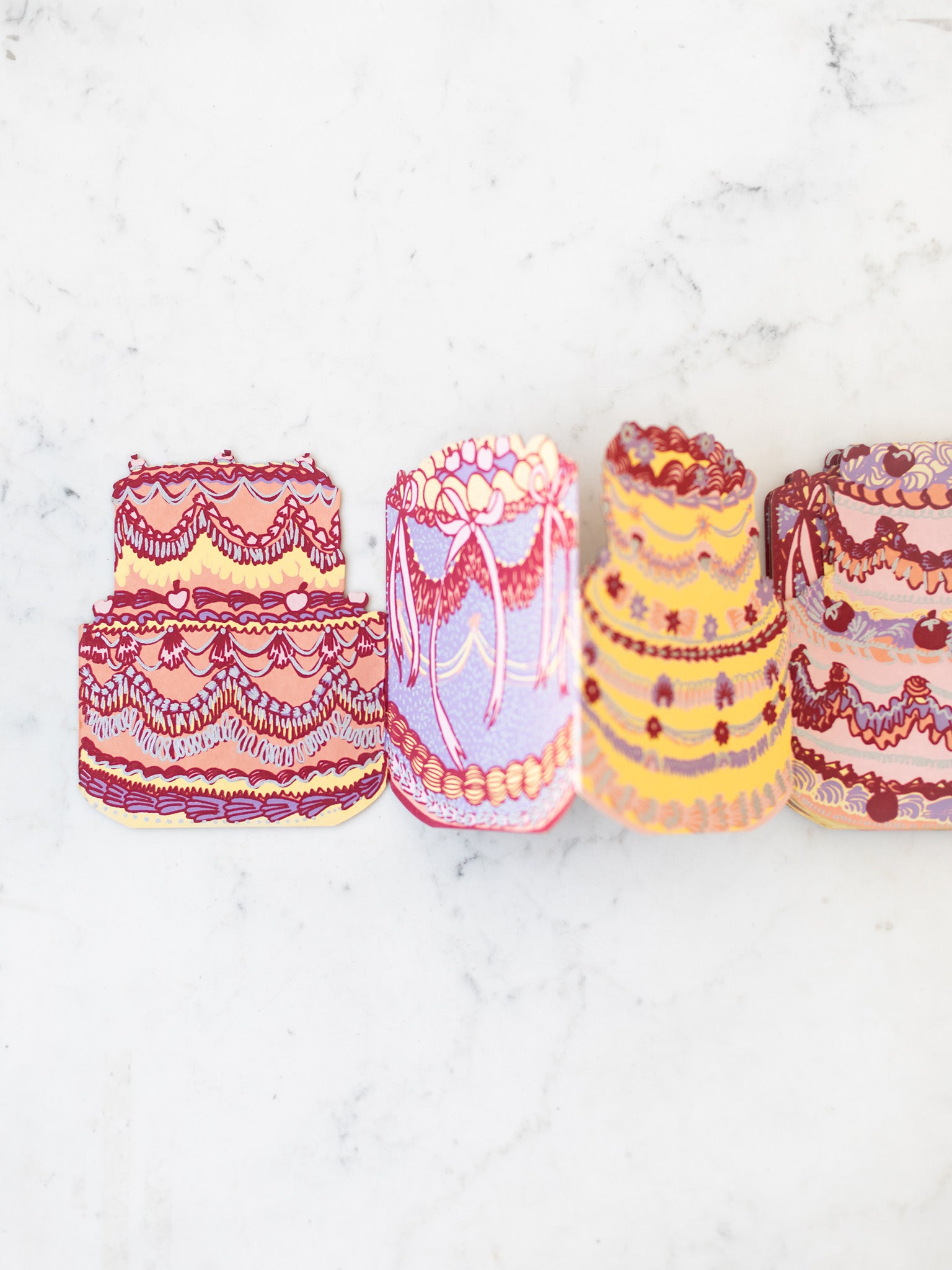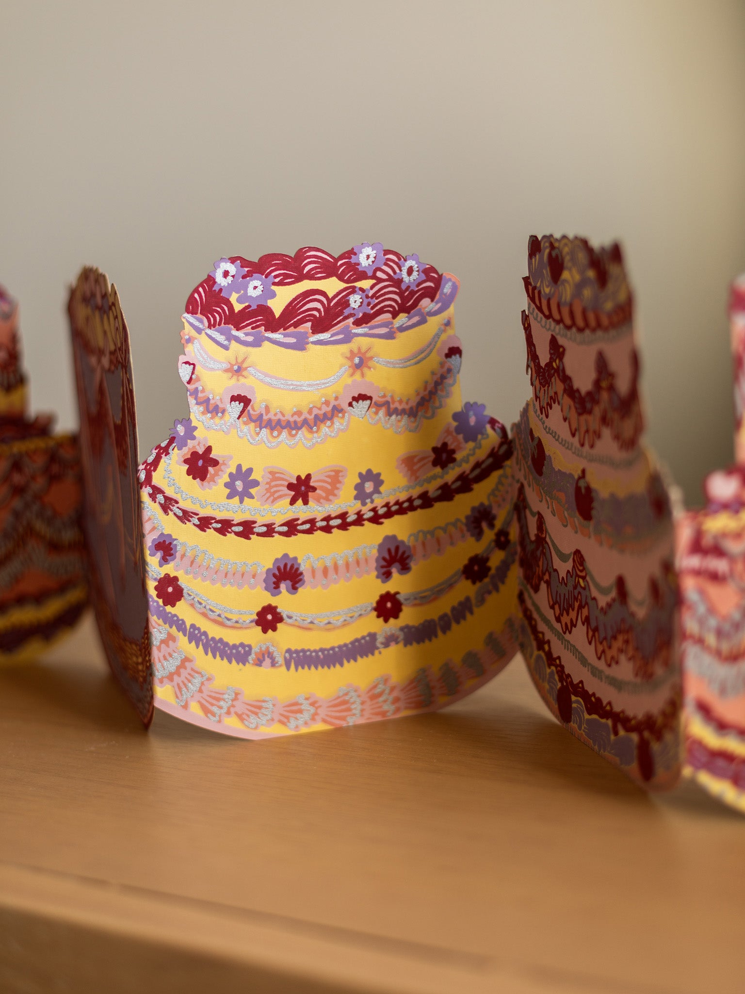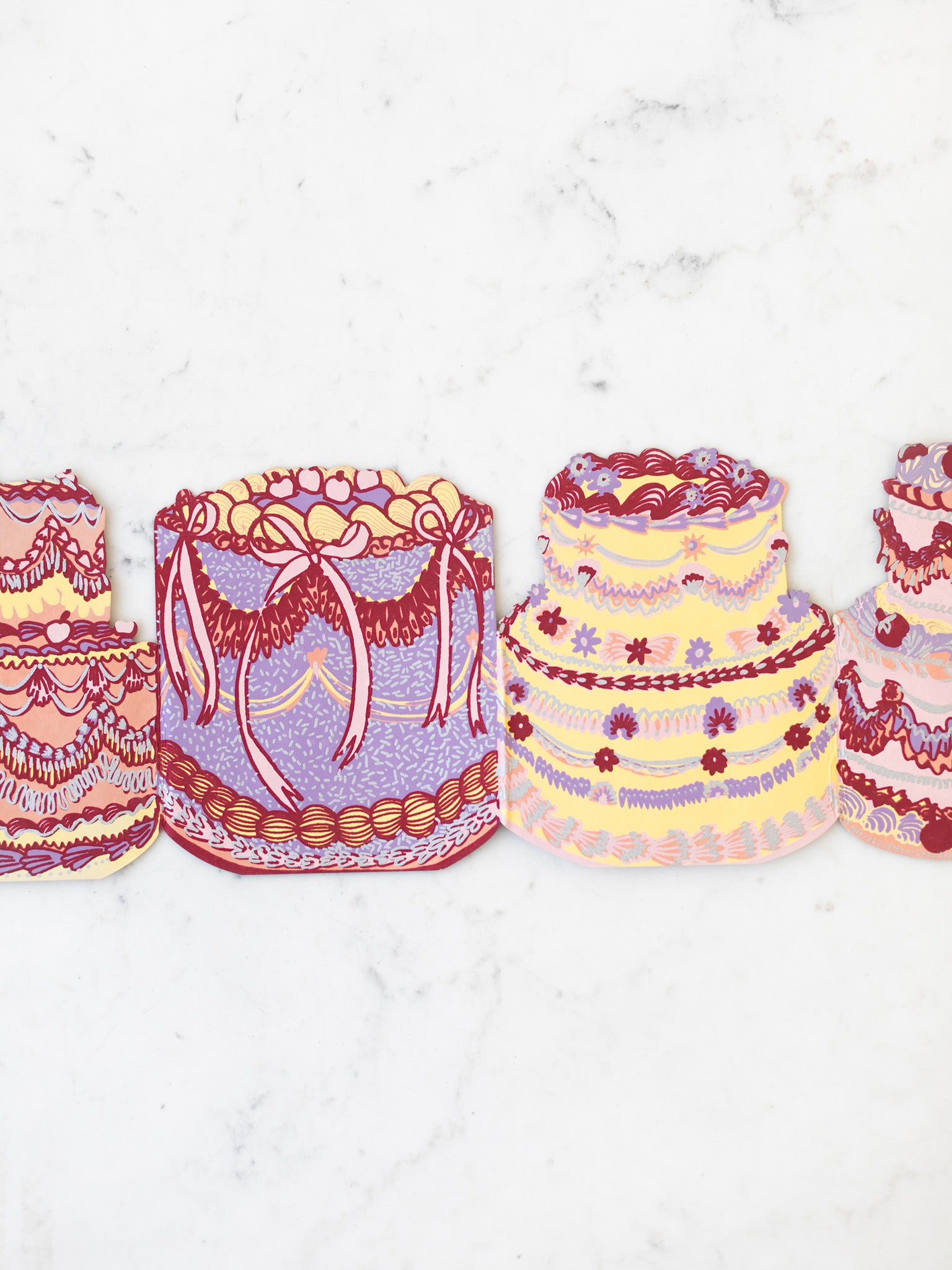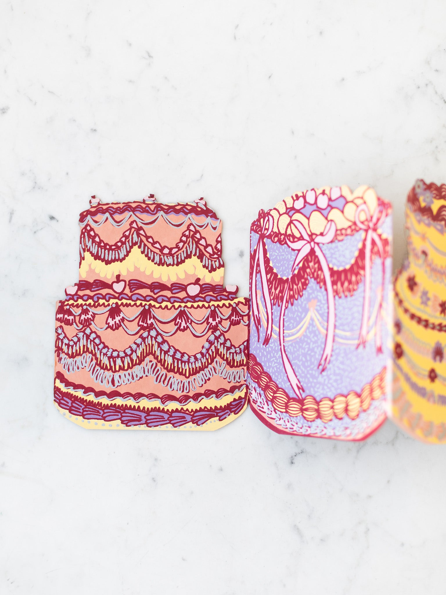 Celebrate a birthday with this paper garland filled with cheerful cake shapes. Each piece is hand-printed on sturdy cotton paper and sewn along a cotton thread, ready to hang right away. It looks lovely draped across a mantel, doorway, or table, adding a bit of color and fun to the room. Because every garland is printed by hand, each one has small variations that make it feel personal and one of a kind.