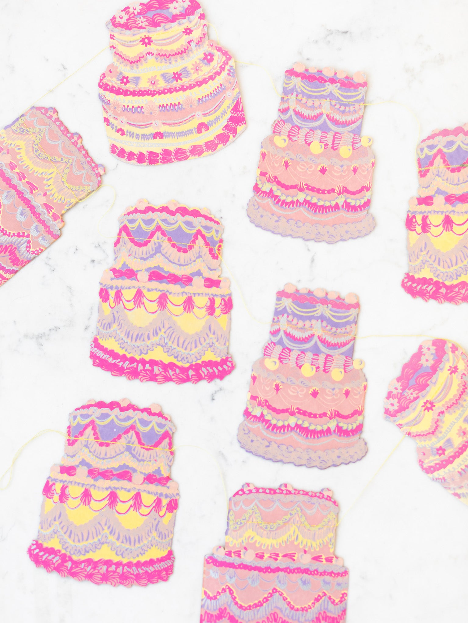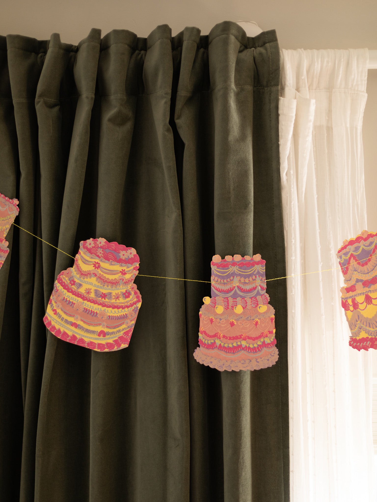 Celebrate a birthday with this paper garland filled with cheerful cake shapes. Each piece is hand-printed on sturdy cotton paper and sewn along a cotton thread, ready to hang right away. It looks lovely draped across a mantel, doorway, or table, adding a bit of color and fun to the room. Because every garland is printed by hand, each one has small variations that make it feel personal and one of a kind.