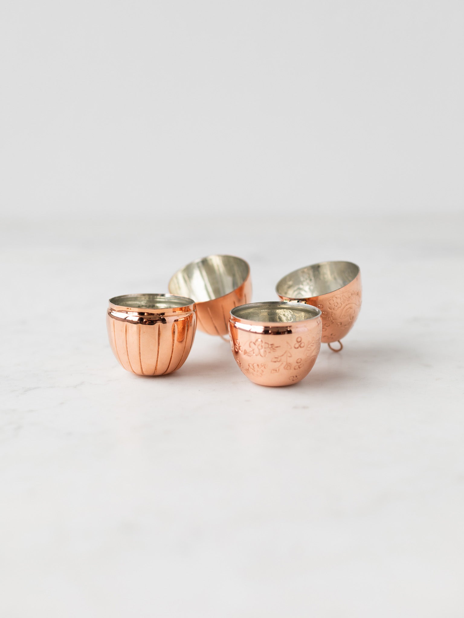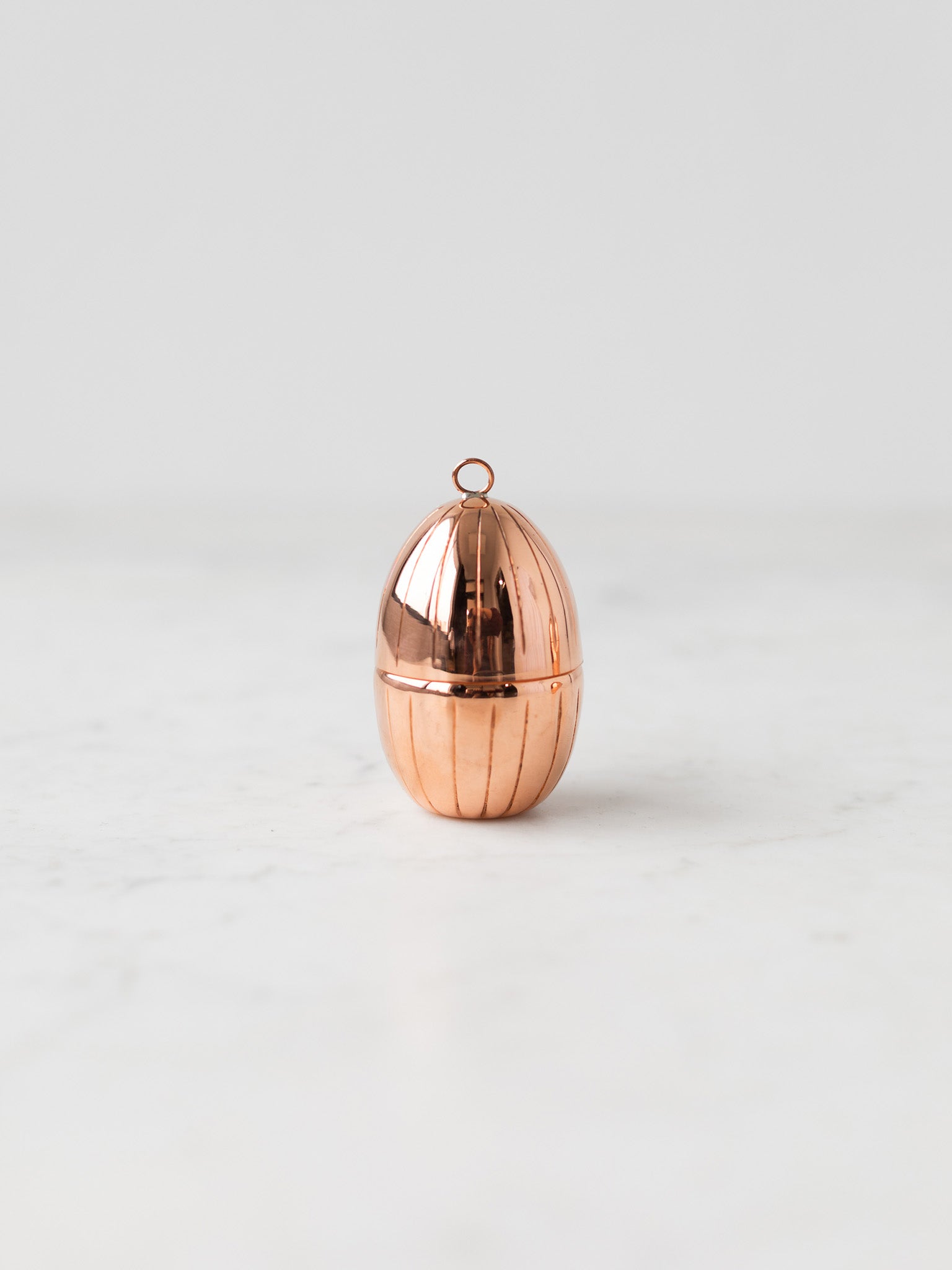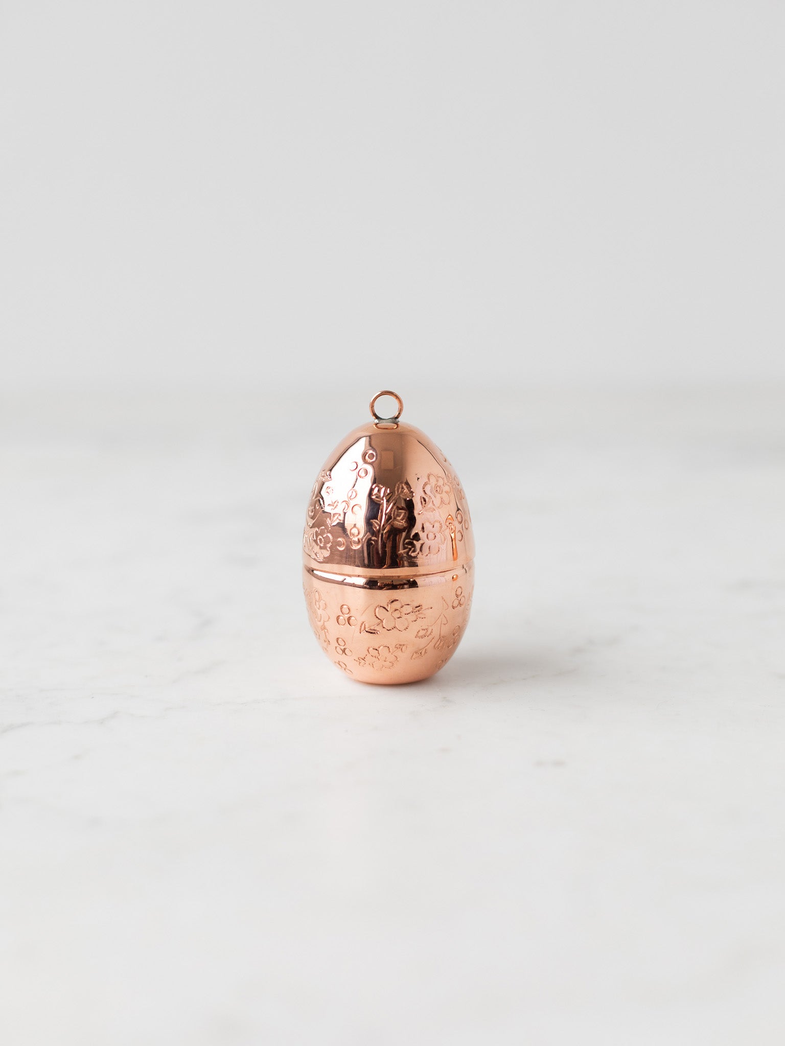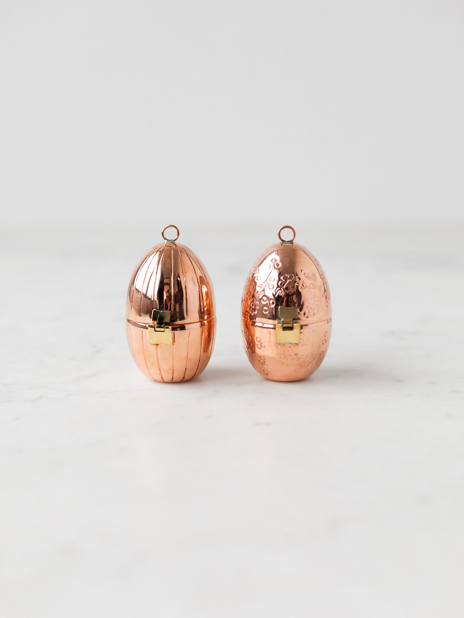 These copper Egg Ornaments are available in two styles, one etched with bird and floral motifs and one with a classic fluted design. Each is made from solid, heavy-gauge copper and opens and closes so you can tuck a small treat or note inside. About the size of a real egg, they include a copper ring for hanging on a tree, garland, or wreath. Finished with a copper ring for hanging, these copper eggs will develop a rich patina with use and grow more beautiful over time.