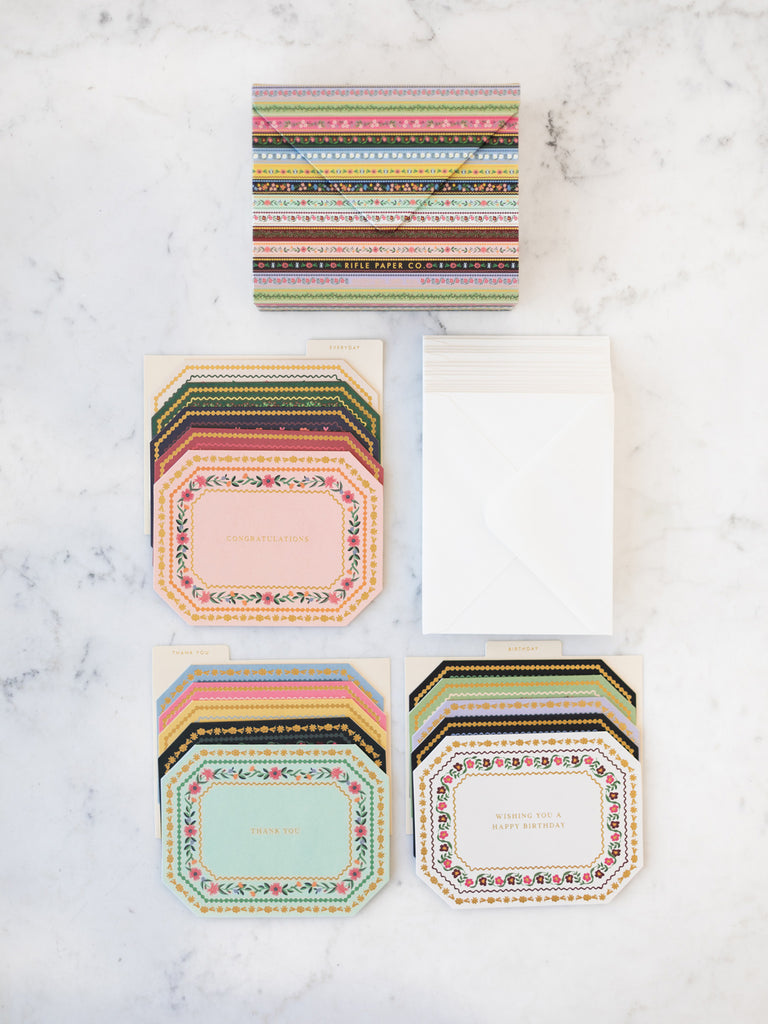 Includes a collection of 15 greeting cards and envelopes for thank-yous (5), birthdays (5), congratulations (1), encouragement (2), love and friendship (1), and sympathy (1)