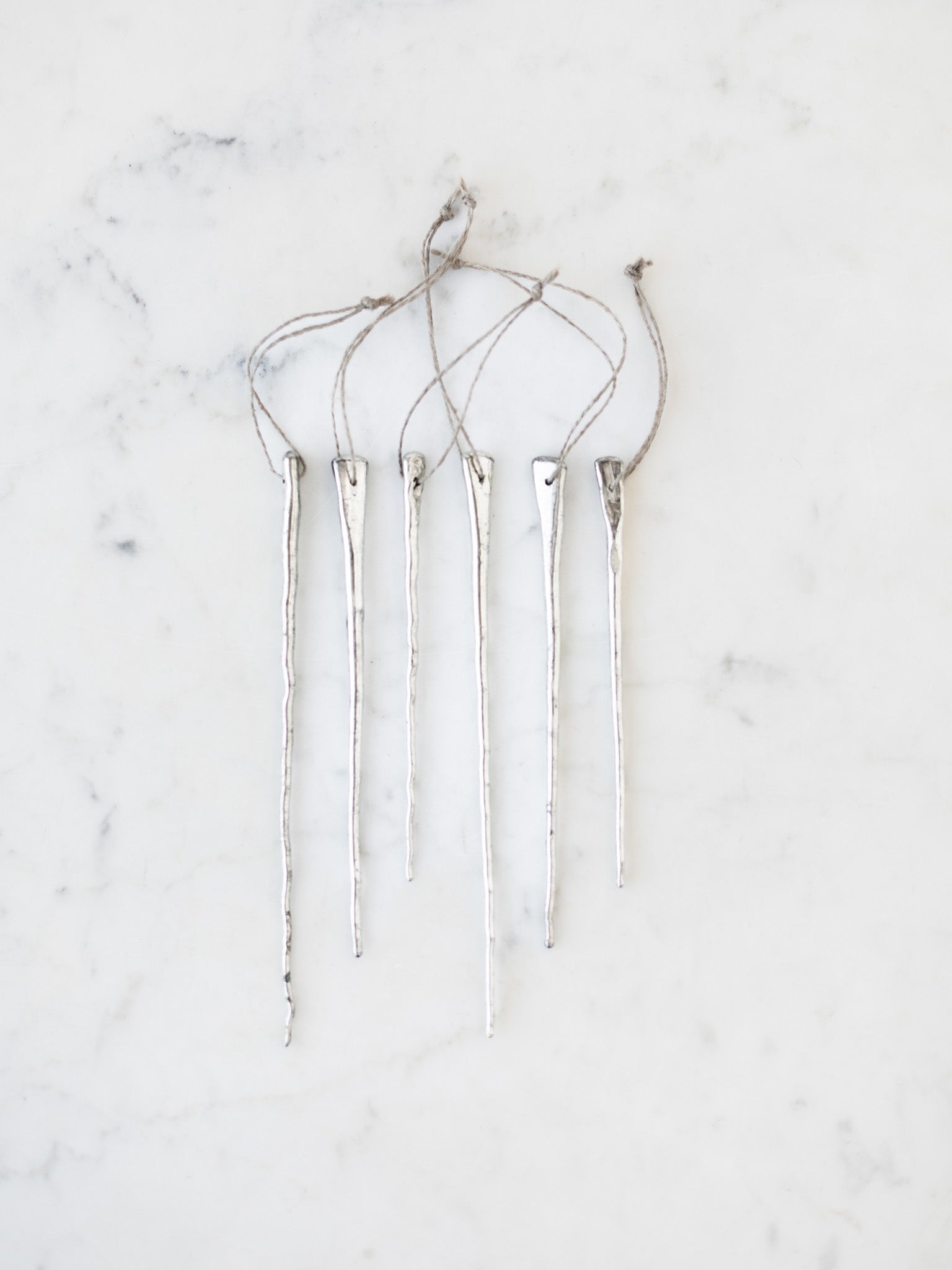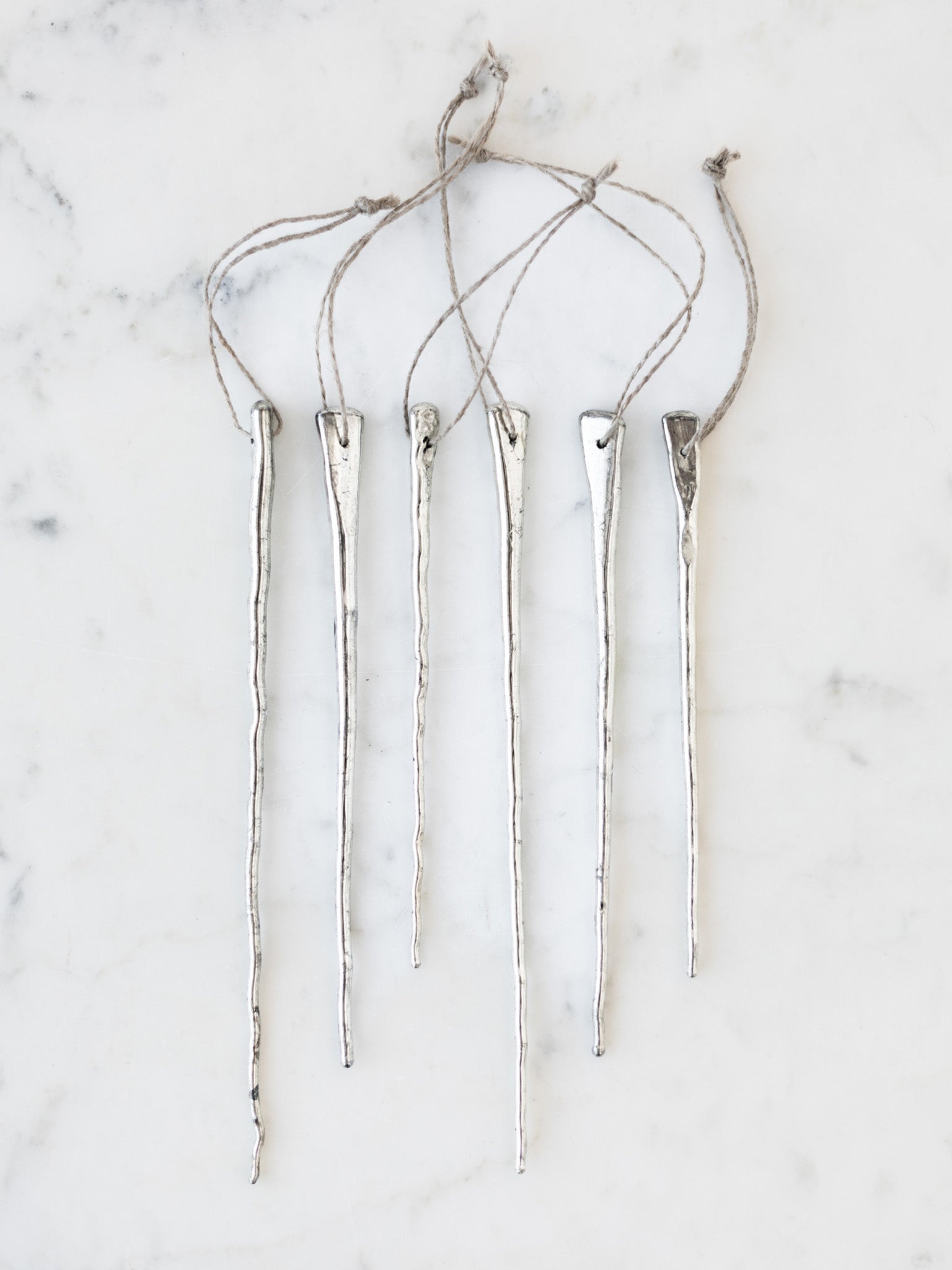These Mercury Glass Icicle Ornaments glimmer like winter frost, adding a silvery shimmer to your Christmas tree. Each one is delicately hand-strung with natural jute and catches the light in the loveliest way, whether hung in a sparkling cluster or tucked among garlands and branches. They will be a joy to unwrap and hang each Christmas for years to come.