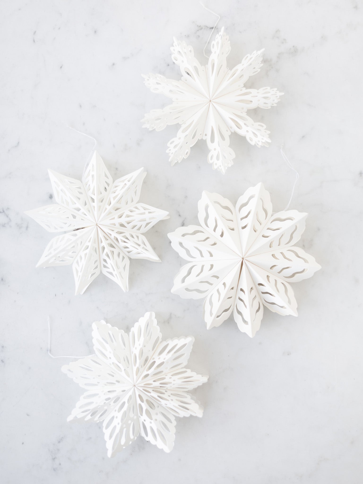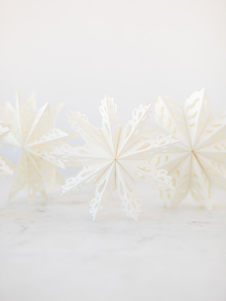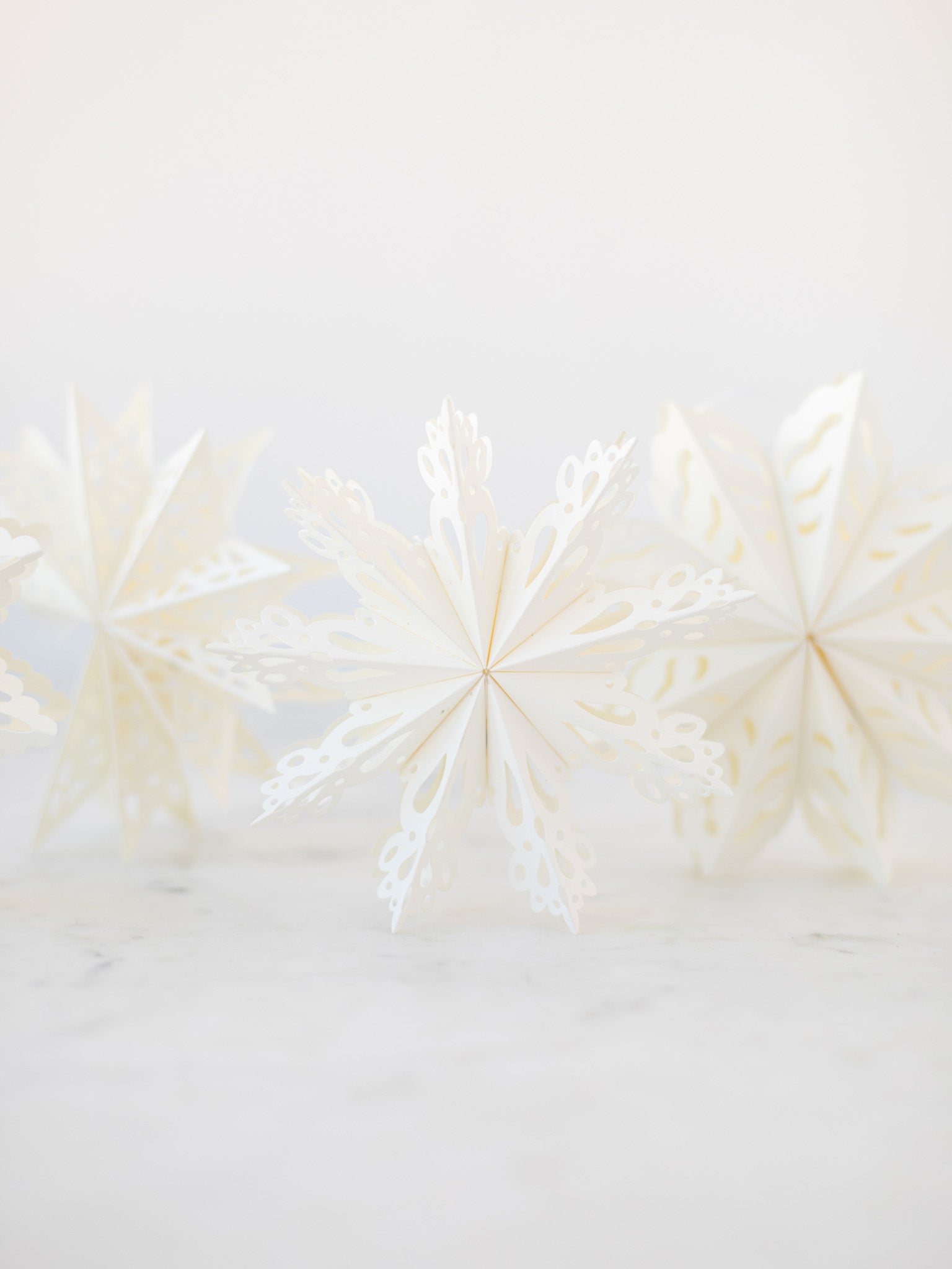 This year we are bringing back one of our favorite decorations of the season, delicate and beautiful paper snowflakes. Add a hint of winter wonder to your home with these Paper Snowflakes. The gold lining paper gleams as it catches the light, making the snowflakes look beautiful when hung in a window, tree, or hallway.