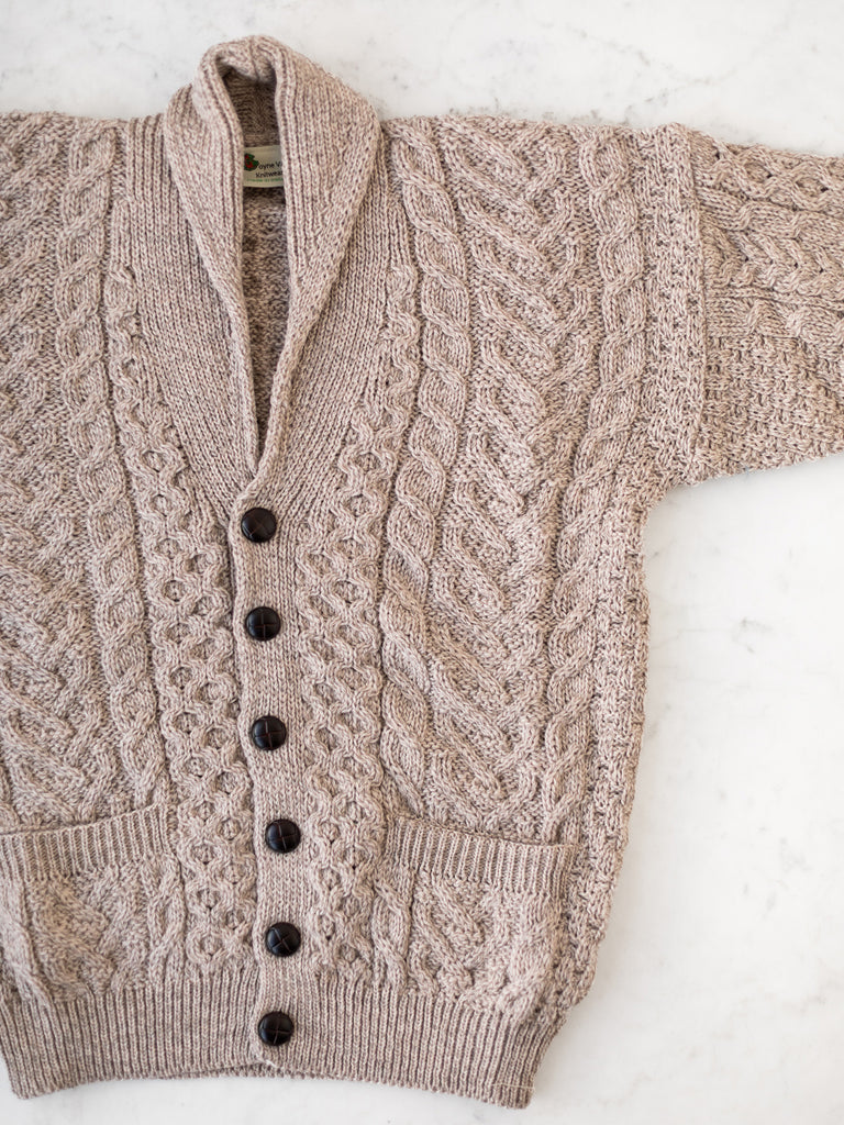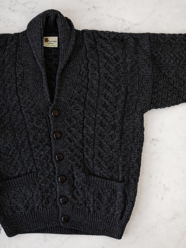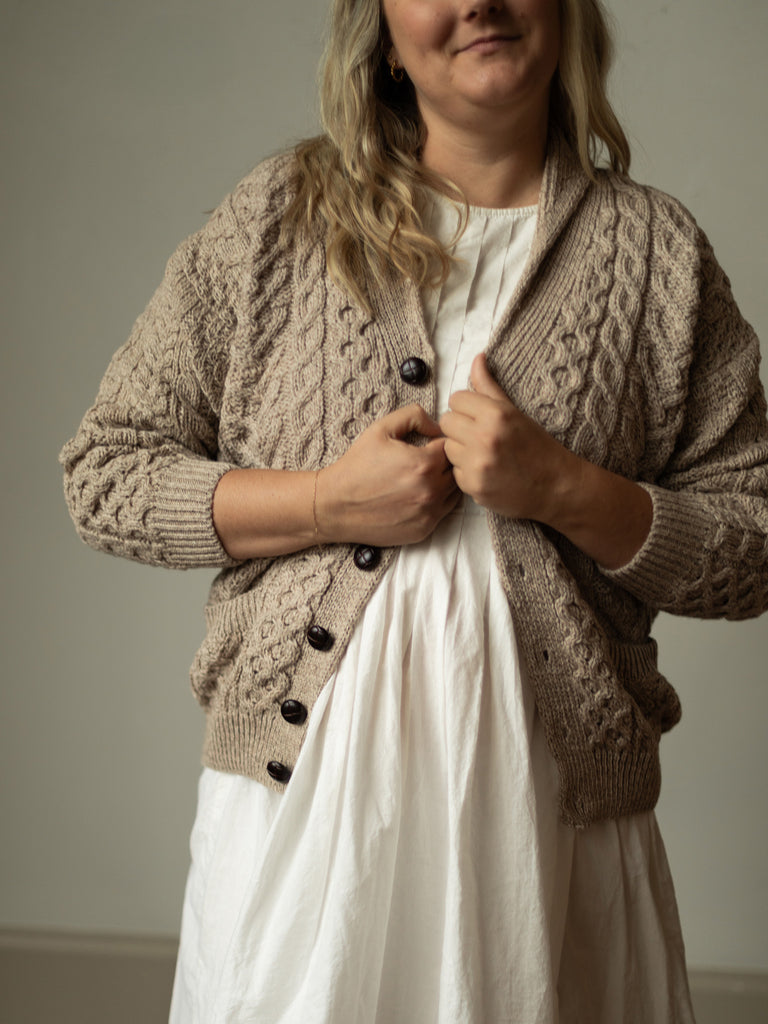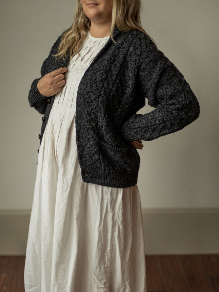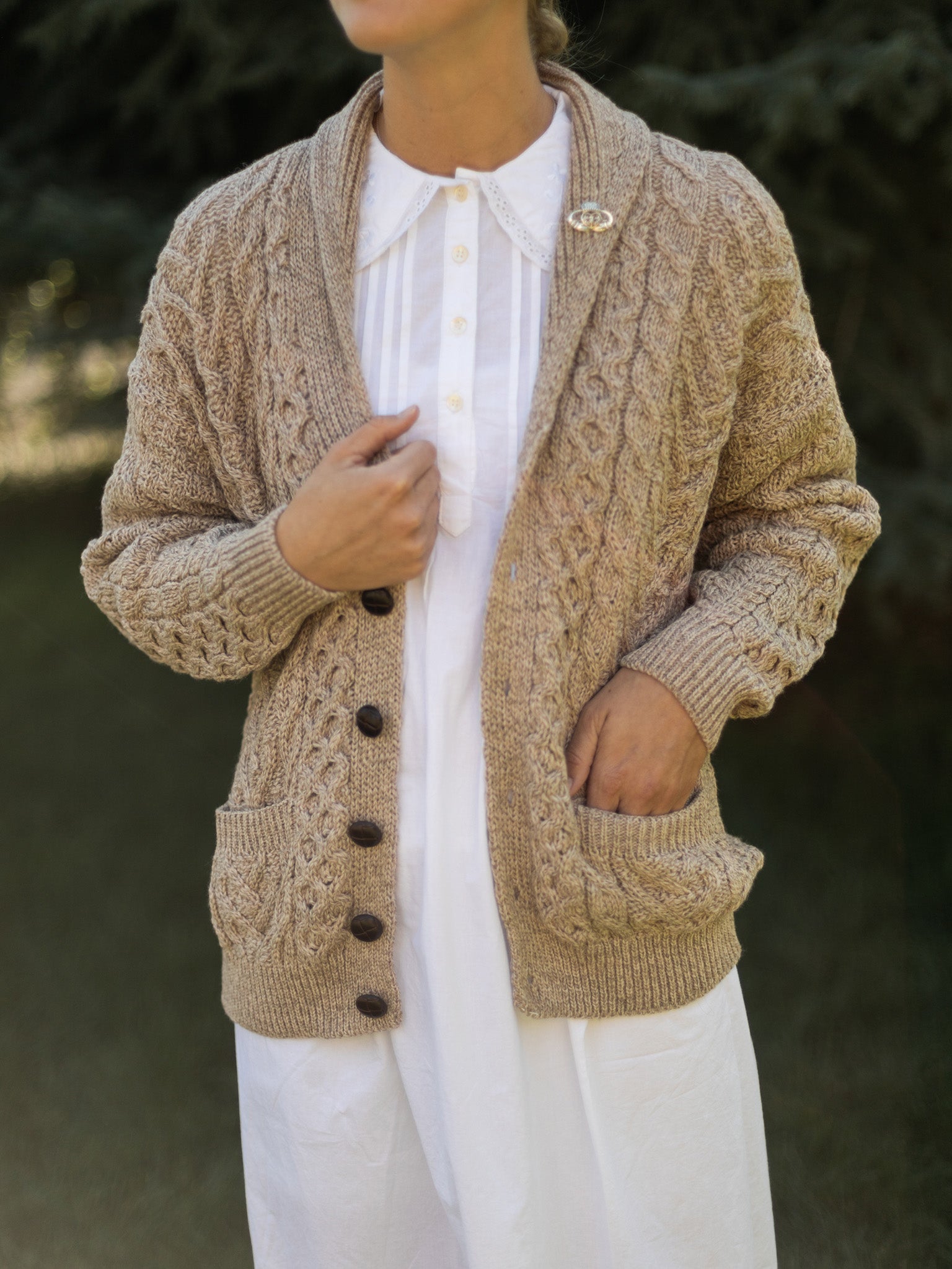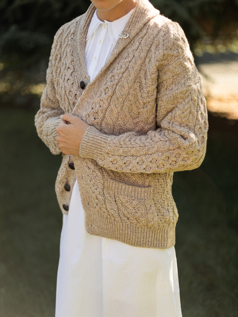 Together, these traditions give the cardigan a sense of history as well as comfort. With its shawl collar, brown football buttons, and practical front pockets, it has a timeless look that suits both everyday errands and quiet evenings at home. It is a piece made to be worn often, carrying warmth in every stitch.