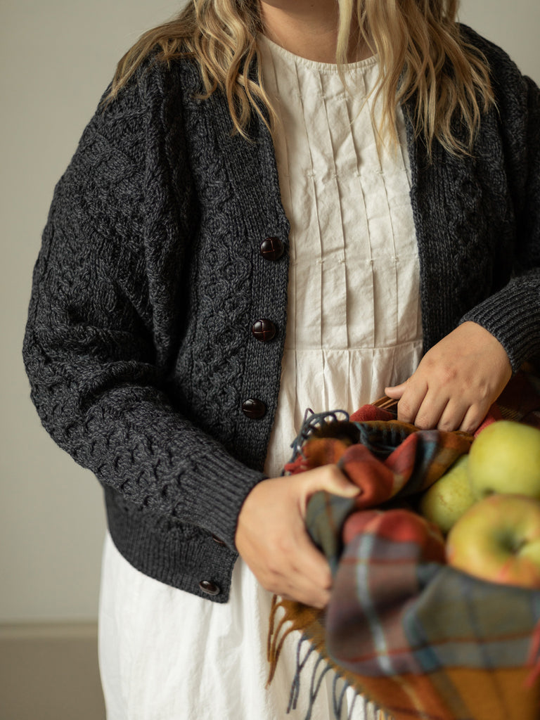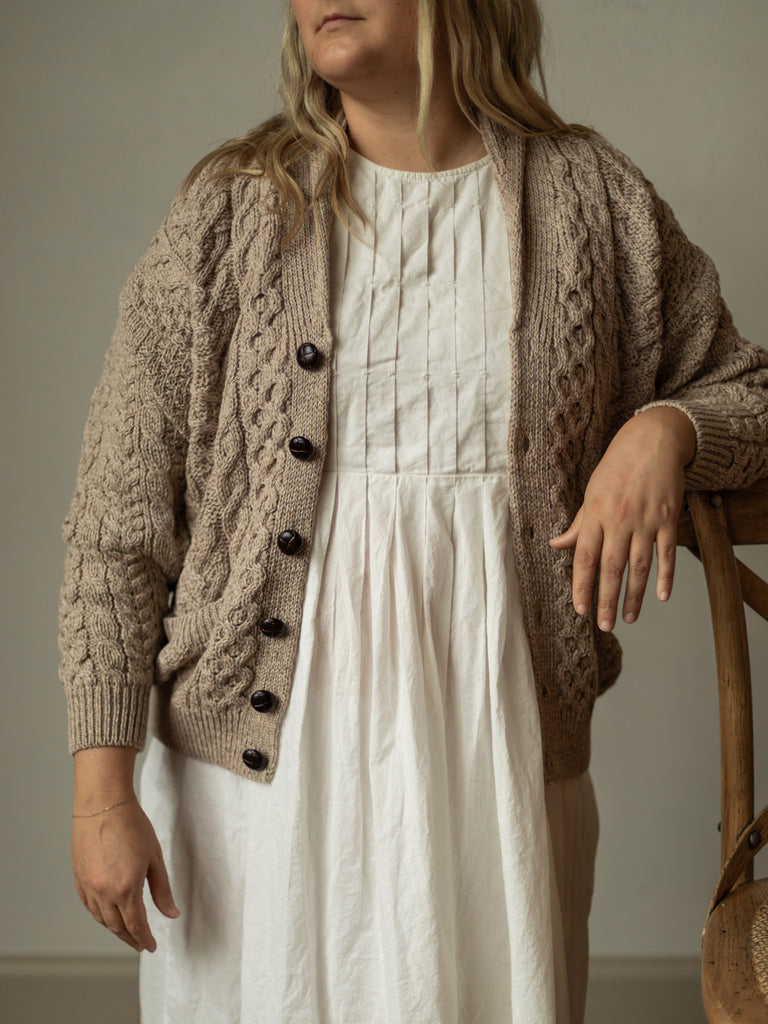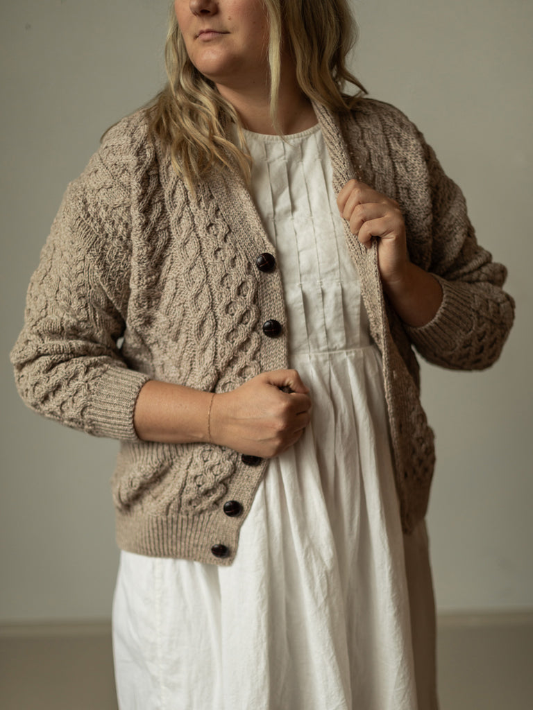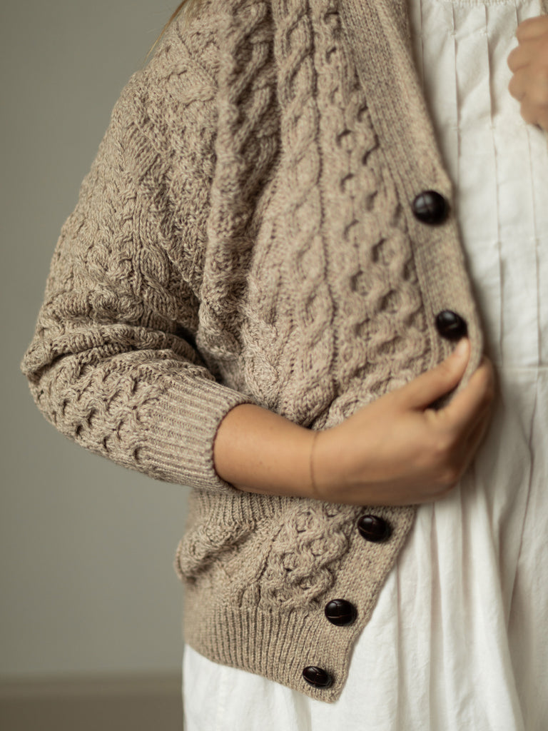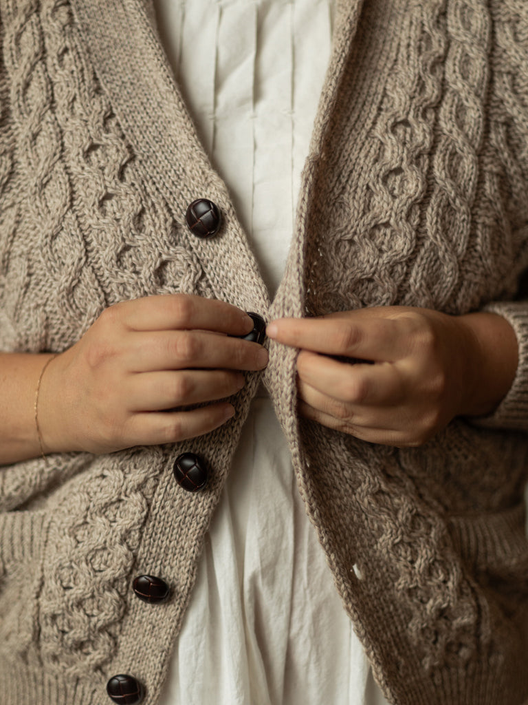 The Highlands Knit Cardigan carries the story of Aran knitting, where the cable stitch once stood for fishermen’s ropes and the hope of safe returns. It's made of Merino wool, a wool known for keeping out the cold while feeling soft against the skin.