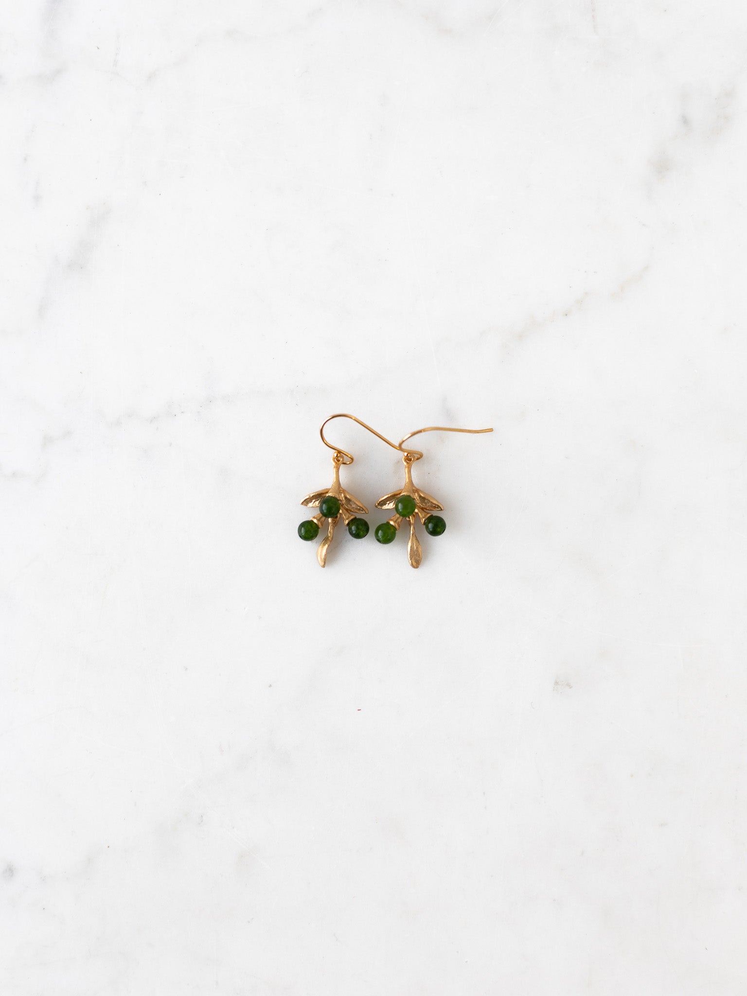 Pepper earrings are cast in 24kt gold-plated bronze and accented with green jade beads. The wires are 925 silver with a 24kt gold plating.
