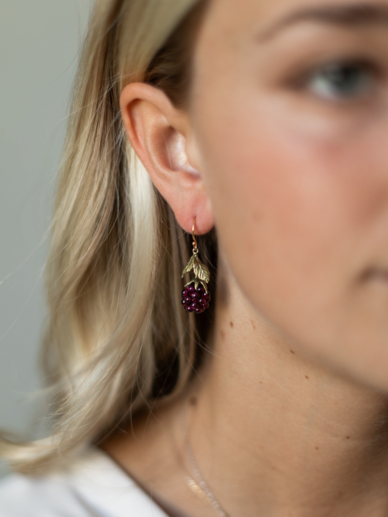 Made of cast bronze leaves and garnet bead raspberries. Posts are 925 silver.