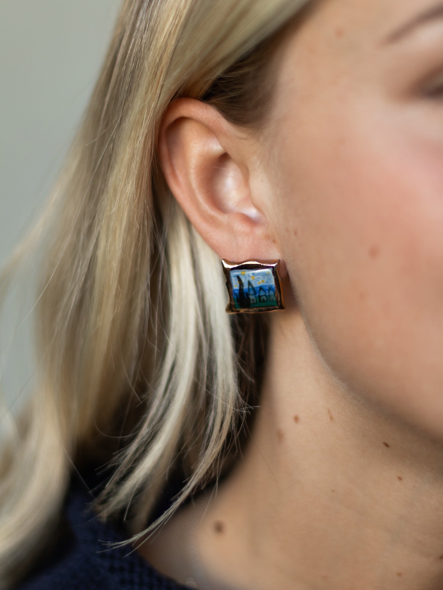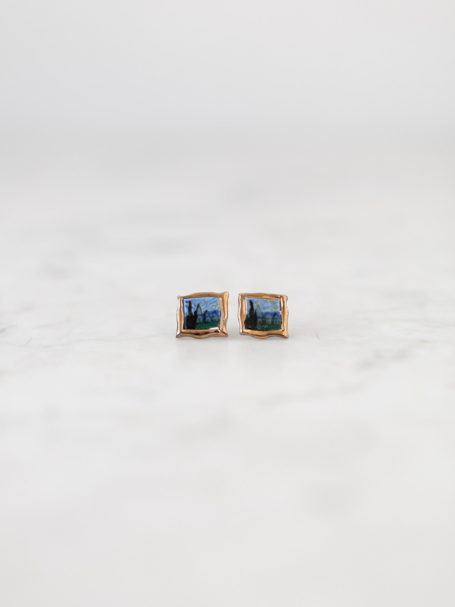 These hand-painted porcelain stud earrings feature a miniature version of Starry Night, one of Vincent Van Gogh’s most iconic and beloved works. Painted in 1889, the swirling sky and bold brushstrokes capture the emotion and wonder that define Van Gogh’s art. We love how artsy and expressive these earrings feel. Wear them on museum visits, creative gatherings, or anytime you want to add an artistic touch to everyday outfits.