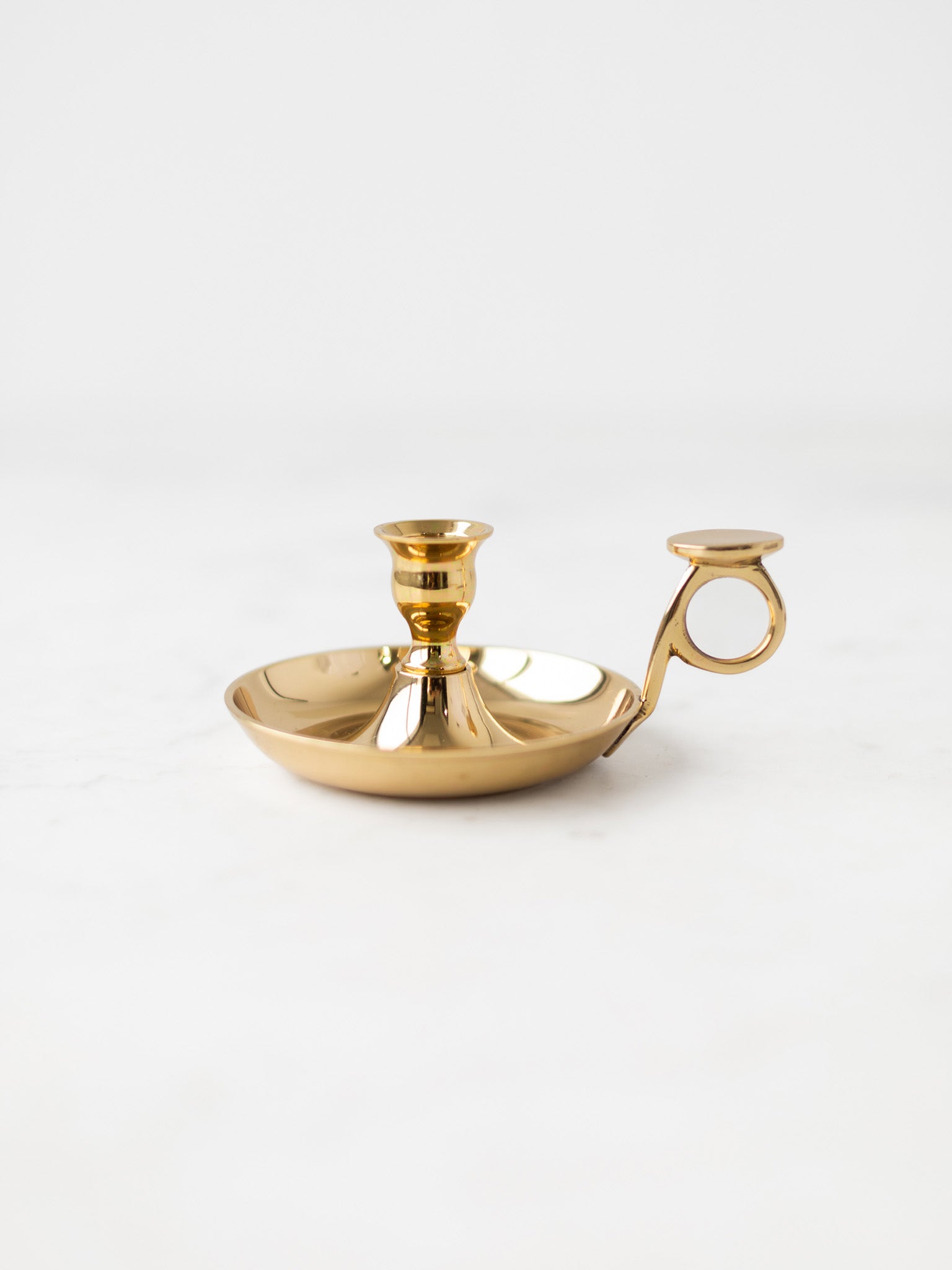 This solid, polished brass chamberstick is inspired by the simple candle holders once carried from room to room in Early American homes, lighting the way at the end of the day. Its warm golden shine is timeless and has a polished finish. The lacquered brass helps keep it bright without constant polishing, so you can simply enjoy the glow. Place a taper inside, strike a match, and it feels like stepping into a slower, softer evening at home.