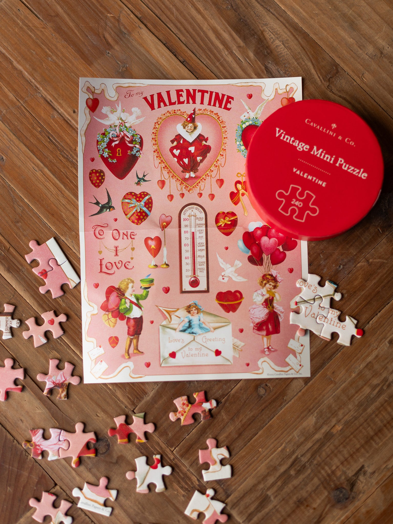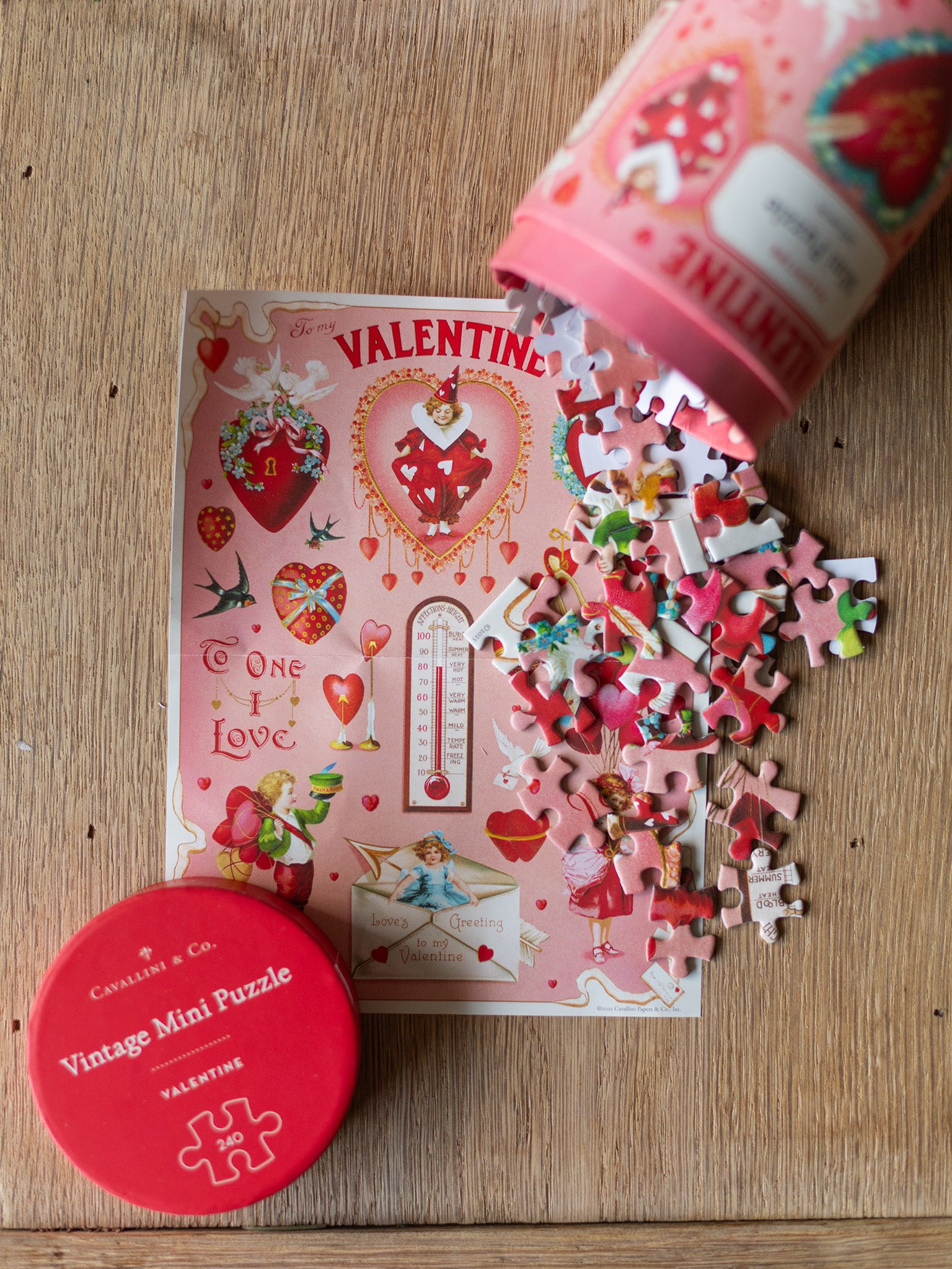 We love this Valentine’s Mini Puzzle. The artwork is pulled from vintage Valentine’s cards, with doves, cupids, candy hearts, and playful old lettering. With 240 pieces, it is easy to finish in one sitting, whether you spread it out on the table or work on it a little at a time. It comes in a reusable tube with a small guide tucked inside. A sweet little puzzle for a quiet afternoon or a thoughtful Valentine’s gift for a puzzle lover.