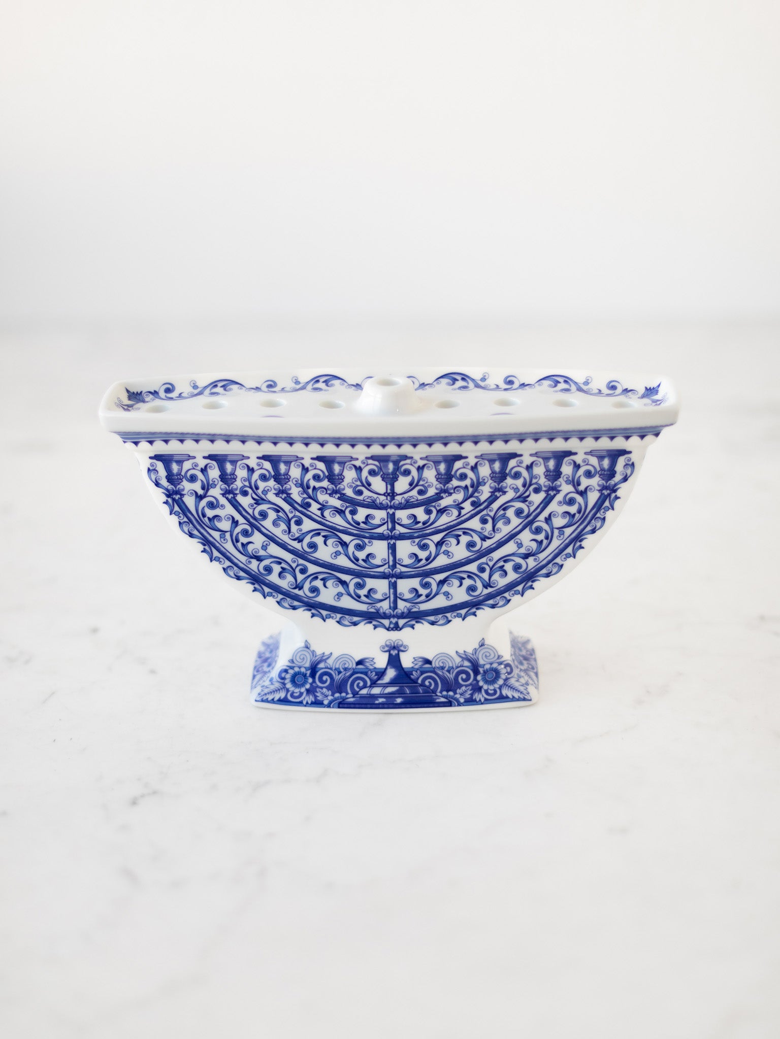 The Spode Menorah is inspired by ornate designs from historic 1880's manuscripts. It features delicate stylized flowers and vines that dance across its surface. Perfect for illuminating the Festival of Lights during Hanukkah celebrations, this stunning piece transcends the season—its refined artistry makes it an elegant year-round focal point that honors tradition while adding timeless beauty to any room.
